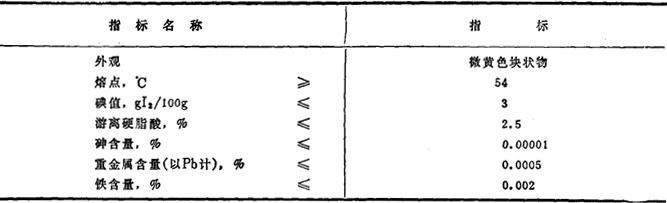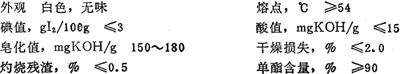 性能 纯白色~淡乳色的蜡状固体,具有刺激性和好闻的脂肪气味,无毒,可燃。在水和醇中几乎不溶,可分散于热水中。极易溶于热的醇、石油和烃类中。熔点58~59℃,相对密度0.97。游离脂肪酸低于5%,碘值3~4gⅠ2/100g。