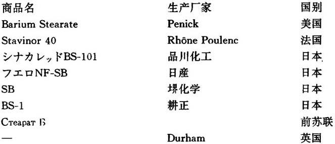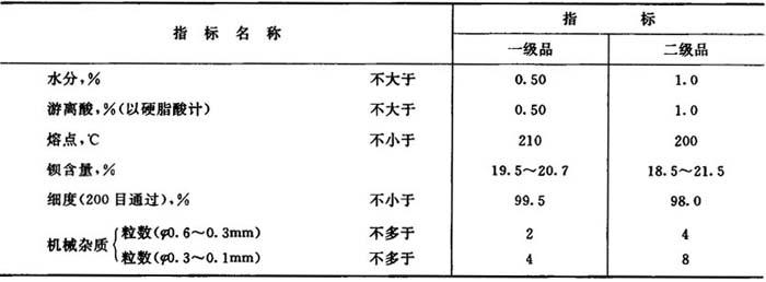 释义 | 硬脂酸钡 【结构式】: 【释文】: 制法 由硬脂酸钠和氯化钡反应而得。 性质 白色细微粉末。钡含量19.5~20.5%。游离脂肪酸量≤1%。水分≤1%。相对密度1.145。熔点>220℃。细度(200目通过)≥99%。不溶于水,溶于苯、甲苯和其它非极性溶剂,在有机溶剂中加热溶解后经冷却变成胶状物。遇强酸分解为硬脂酸和相应的钡盐。在空气中有吸水性。 规格 HG2-1205-79 硬脂酸钡(轻质)应符合下列要求 用途 本品可作为聚氯乙烯及氯乙烯共聚物的热稳定剂,具有优良的润滑性,长期耐热性好,稳定效能比硬脂酸钙大,但不及硬脂酸铅。与镉皂、锌皂或环氧化合物并用有良好的协同效应。一般用量为0.1~2%。与少量的铅系稳定剂并用能改善制品的电性能。本品主要用于透明薄膜、薄片、人造革、硬质板材和管材等。在软质品中,常与镉、镉-锌或镉-铅皂类配合。在耐硫化人造革配方中常与锌皂并用。在管材和电缆料中常与盐基性铅盐和铅皂配合。在波纹板中,常与镉皂、铅皂及盐基性铅盐配合。本品无硫化氢污染性。 本品用量大时有离析结垢现象。 毒性 本品有毒,毒性系数T=2,典型的中毒症状是呕吐、腹痛、下痢、血压上升、脉搏跳动紊乱等。 国内生产厂 河北石家庄市化工九厂 辽宁沈阳市助剂厂 天津红旗化工厂 吉林市塑料助剂厂 上海延安油脂化工厂 南京金陵化工厂 温州塑料助剂总厂 厦门电化厂 辽宁丹东化工厂 杭州制皂厂 江苏淮安县化工二厂 湘潭市皮革化工厂 盐城化工二厂 昆山化工二厂 无锡溶剂总厂 四川重庆长江化工厂 安徽省蚌埠肥皂厂 武汉油脂化学厂 湖北武汉染料厂附属工厂 贵州桐梓化工厂 山东青岛第三化工厂 北京长阳化工厂 南京东方化工厂 徐州染料化工厂 广东汕头市助剂厂 广东潮安塑料材料厂 江苏新江县化工厂 淮阴县化工厂 浙江嘉善县化工厂 西安市勤俭化工厂 国外生产厂 |