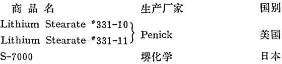 释义 | 硬脂酸锂 【结构式】: 【释文】: 制法 由氢氧化锂水溶液与硬脂酸加热反应而得。 性质 白色细微粉末。氧化锂含量5.3~5.6%。游离酸含量0.2%。水分0.3%。熔点220~221.5℃。粒度(99%以上小于)74微米。18℃时的溶解度(克/100毫升溶剂):水0.09、乙醇0.04、乙醚0.04。 用途 本品可用作聚氯乙烯热稳定剂,适用于透明制品,与邻苯二甲酸酯类增塑剂配合使用时,制品不发生白雾,薄膜的透明性良好。本品较其它硬脂酸盐易溶于酮类中,故对压花操作影响较小。本品可作为钡皂、铅皂和镉皂的无毒取代品。本品还可与磷酸酯类增塑剂配合使用。 毒性 本品可视为无毒,美国食品和药物管理局、日本氯乙烯食品卫生协会许可其用于食品包装材料。 国外商品名 |