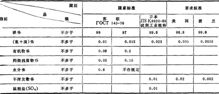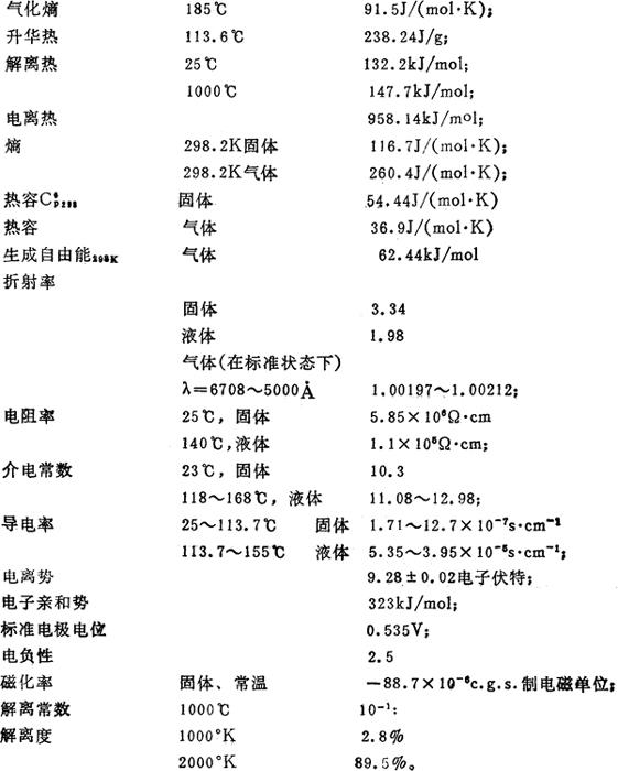 一、物理性质 紫黑色鳞晶或片晶,有金属光泽。性脆,易升华,蒸气呈紫色。碘对光的吸收带在可见光谱的中间部分,故透射的光只是红色和紫色。碘微溶于水,溶解度随温度升高而增加,不形成水合物;难溶于硫酸;易溶于有机溶剂;在不饱和烃、甲醇、乙醇、乙醚、丙酮、吡啶中呈褐色,在苯、甲苯、二甲苯、溴化乙烷中呈褐红色,在氯仿、石油醚、二硫化碳或四氯化碳中呈美丽的紫色;碘也易溶于氯化物、溴化物及其他盐溶液,更易溶于碘化物溶液,形成多碘离子。水微溶于液碘。液碘是一种良好溶剂,可溶解硫、硒、铵和碱金属碘化物、铝、锡、钛等金属碘化物及许多有机化合物。 碘具有特殊刺激臭,有毒,对金属有腐蚀性。 其他物理数据为: 固体相对密度 液体相对密度 120℃ 3.960; 180℃ 3.736; 气体相对密度 185℃ 6.75; 膨胀系数 0~113.6℃ 2.81×10-4/度; 粘度 116℃ 0.002268Pa·s; 185℃ 0.001414Pa·s; 表面张力 116~155℃ 0.0003688~0.0003404N/cm; 蒸气压: 水解平衡常数 20℃ 1.5×10-13~3×10-13; 晶格常数 18℃ a=0.4776nm,b=0.7250nm,c=0.9771nm; 结晶半径 0.21nm; 共价半径 0.1334nm; 在水中溶解度; 碘在有机溶剂和水之间的分配系数: 在有机溶剂中溶解度,25℃: 注:①每升溶液中的克数。 ②碘在无水丙醇中15℃时的溶解度. 在不同浓度乙醇水溶液中的溶解度,15℃: 在碘化钾水溶液中的溶解度,25℃: 在碘化钠水溶液中的溶解度,25℃: 在盐酸水溶液中的溶解度,25℃: 在硫酸水溶液中的溶解度,25℃: 碘蒸气在空气中饱和时的浓度: 熔点 113.6℃; 沸点 185℃; 临界温度Tc 液体 553℃; 临界压力Pc 液体 11753700Pa; 临界密度 1.64g/cm3; 导热系数 24.4℃ 4.21×10-3J·cm-1,s-1·℃-1; 比热 固体 25~113.6℃ c=0.2118J/(g·℃); 熔融热ΔH熔融 113.6℃ 62.13J/g; 生成热ΔH生成 气体 25℃ 62.26kJ/mol; 气化热ΔH气化 185℃ 164.35J/g; 二、化学性质 碘不能直接与碳、氮或氧化合;与臭氧反应生成氧化物;与氟、氯、溴等反应,分别生成氟化物、氯化物及溴化物,与氨反应生成爆炸性的三碘化氮;在有水分存在时,与磷反应生成三碘化磷及四碘化二磷;与铂只能在高温下反应;与锆反应生成挥发性的四碘化锆;与其他多种金属可在常温反应,形成不挥发碘化物。碘在酸性溶液中是氧化剂,可氧化亚硫酸盐、重亚硫酸盐、硫代硫酸盐、亚砷酸盐、亚锡酸盐为硫酸盐、连四硫酸盐、砷酸盐及锡酸盐。强氧化剂可使碘氧化成碘酸或碘酸盐。碘与二氧化硫在无水甲醇与吡啶的混合液中不反应,但如有水分存在,二氧化硫即被氧化为硫酸,碘被还原为碘化氢。碘遇淀粉显蓝色。与饱和烃作用,在有氧化铅或碘酸存在时,碘可取代其中的氢;与不饱和烃作用,可在双键处加成,形成多碘化物。 三、用途 碘是制造无机和有机碘化物的基本原料。主要用于医药卫生方面,用以制造各种碘制剂、杀菌剂、消毒剂、脱臭剂、镇痛剂、放射性物质的解毒剂;碘化物也被用作饮水净化剂、游泳池消毒剂。在农业上,碘是制农药的原料,也是家畜饲料添加剂。在工业上,用于生产合成染料、烟雾灭火剂、照相感光乳剂、切削油乳剂的抑菌剂等;还用于制造电子仪器的单晶棱镜、光学仪器的偏光镜,能透过红外线的玻璃、皮革及特种肥皂等;在有机合成反应中,碘是良好的催化剂;碘也是松香、妥尔油及其他木材制品的稳定剂,烷烃和烯烃的分离剂,高纯度锆、钛、铪、硅和锗的提炼剂;碘还被应用于有机化合物的甲基化、异构化和脱氢反应。碘还用作分析化学试剂。 四、质量标准 我国碘的行业标准(ZBX38002-88)规定碘的感官指标为灰黑色具有金属光泽的片状或块状晶体,有辛辣的刺激味;化学指标应符合表1-1-38的要求。 表1-1-38 碘的化学指标 前苏联、日本、美国、波兰碘的标准见表1-1-39。 表1-1-39 前苏联、日本、美国、波兰碘的标准 |
