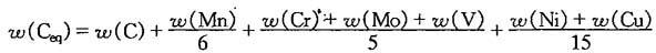 释义 | 碳当量 把碳钢和低合金钢中的合金元素(包括碳)含量按其对淬硬、冷裂的影响程度换算成碳的相当含量的总和叫碳当量.它可作为评定碳钢和低合金钢焊接性的一种参考指标. 国际焊接学会(IIW)推荐的碳当量公式如下: 式中化学元素符号都表示该元素在钢中的质量分数.在计算碳当量时,元素含量都取其成分范围的上限. 根据一般经验,碳当量ω(Ceg)<0.4%时,淬硬倾向校焊接性良好,焊接时一般不需要预热;ω(Ceg)=0.4%~0.6%时,淬硬倾向较大,焊接性较差,一般需要预热;ω(Ceg)>0.6%时,淬硬倾向严重,焊接性差,需要较高的预热温度和严格的工艺措施. |