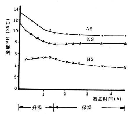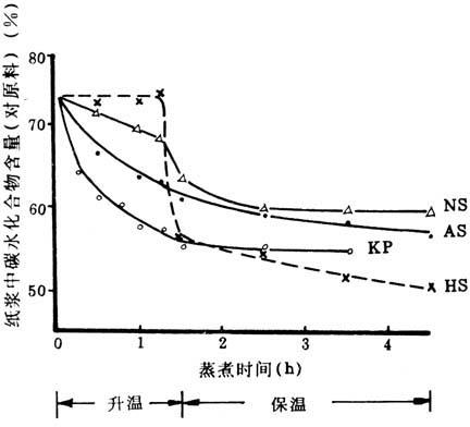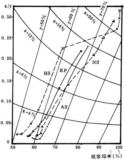 释义 | 碳水化合物的溶出规律 蒸煮的目的是尽量除去木质素和最大限度地保留碳水化合物。但在脱木质素的同时碳水化合物不可能不受到损伤。 荻在不同方法蒸煮中碳水化合物的溶出情况见图4-3-14。在145℃以前KP法和AS法较NS法和HS法碳水化合物的溶出快得多,说明荻中存在较多碱易溶半纤维素。在145℃至蒸煮最高温度,NS法和HS法的溶出速度超过KP法和AS法,尤以HS法溶出速度急剧增加。保温阶段HS法继续溶出,而其它三种方法溶出较少。当蒸煮可漂浆时,纸浆碳水化合物的溶出率HS法>KP法>AS>NS法,分别为30.0%、24.8%、19.6%、18.5%。蒸煮过程中碳水化合物的损失主要是由于纤维素特别是半纤维素的碱性降解(剥皮反应和碱性水解)和酸性水解所致。这与蒸煮液的pH值,蒸煮温度和蒸煮时间密切相关(见图4-3-15)。HS法pH值高,碱性降解较严重,NS法pH值接近中性,对碳水化合物损伤最小,AS法pH值虽高于NS法,但由于该法脱木质素快,在蒸煮可漂浆时碳水化合物溶出率与NS法相差不多。 图4-3-14 蒸煮过程中纸浆碳水化合物含量的变化 KP-硫酸盐法 AS-碱性亚硫酸钠法 NS-中性亚硫酸钠法 HS-亚硫酸氢镁法 图4-3-15 蒸煮过程中药液pH的变化 荻在不同方法蒸煮过程中木质素与碳水化合物的变化趋势如图4-3-16所示。在蒸煮可漂浆时应考虑尽量除去木质素但又不使碳水化合物受到严重损伤。由图4-4-16可见,在浆中木质素含量2%左右(对原料1%左右)时各曲线均发生转折,沿等木质素碳水化合物则继续溶出,纸浆得率不断下降,因此应及时停止蒸煮。各转折点的纸浆得率为NS法63%、AS法62%、KP法57%、HS法54%,NS法>AS法>KP法>HS法。 图4-3-16 罗斯图 x=纸浆中总木质素(Klsaon木质素+酸溶木质素)含量(对原料),(%); Y=纸浆中碳水化合物含量(对原料),(%) |