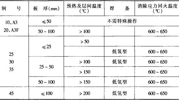 释义 | 碳素结构钢的焊接 1.低碳钢的焊接 低碳钢的含碳量≤0.25%,可焊性良好,一般不需要特殊的措施。低碳钢弧焊工艺应保证接头与母材等强度,接头应具有较低的脆性转变温度,避免超标的焊接缺陷,以提高结构的工作可靠性。 低碳钢弧焊焊缝金属中的含碳量一般均低于母材。焊缝依靠提高硅、锰的含量和弧焊所具有的较高的冷却速度而达到与母材等强。冷却速度过大会使塑性及韧性下降,但对单层焊焊缝脆性转变温度无明显影响。焊缝的冷却速度取决于母材的板厚、焊接工艺参数及施焊温度。厚板单层角焊缝、多层角焊缝或多层对接焊的最后一层,如冷却速度过大,焊缝机械性能会有明显的变化。因此,厚板单层角焊缝的焊角尺寸不得过小,多层焊应尽量连续焊完最后一层,表面缺陷的补焊焊缝应具有正常的焊缝尺寸,长度不能过短,必要时应局部预热100~150℃等。多层焊焊缝的脆性转变温度比单层焊低些。 低碳钢弧焊焊缝的抗热裂性能好,但当母材的含碳量接近上限时(0.21%~0.25%),对角焊缝、对接多层焊的第一道、要求焊透的单层单面焊缝及大间隙对接焊的第一道焊缝应在工艺上避免窄而深的焊缝,否则可能会产生热裂纹。采用碱性低氢型焊条有利于避免产生热裂纹。 低碳钢电弧焊的各种规范对热影响区的性能无明显影响,但应避免线能量过大,以免接头过热。 大刚度低碳钢结构在严寒天气施焊时,应适当考虑焊前预热。 沸腾钢含氧量较高,钢板中心有着明显的偏析带,焊接时易产生裂纹,厚板焊接还有层状撕裂倾向,其时效倾向性也较大,焊接接头的脆性转变温度较高,故一般不宜用作承受动载荷或在严寒下工作的重要焊接结构。 2.中碳钢的焊接 中碳钢的含C量在0.25%~0.50%之间,其焊接性较差,易产生淬硬组织和冷裂纹,热裂纹倾向较大,常须预热和后热。焊接接头的塑性和抗疲劳强度均较低。尽可能选用低氢型碱性焊条,不要求等强时,尽量选用强度等级低的焊条。在不允许预热时,可采用铬镍不锈钢焊条,例如E0-19-11-16(A102)、E1-23-13-16(A302)等。施焊时,均应使用小电流、慢焊速及多层焊。 预热可降低热影响区的淬硬倾向,防止冷裂,可改善焊接接头的塑性,减小焊后残余应力。但在大刚度的大型结构上局部预热不当,可能会增大热应力。 在大型结构焊补时,如预热有困难时,则可采用碱性低氢型焊条不预热施焊,但必须从操作技术上采取适当措施,例如将工件置于立焊或半立焊位置,焊条作横向摆动,摆动幅度为焊条直径的5~8倍。这种相当于短焊道连续多道多层焊的操作方法,可使母材热影响区的任何-点都能在短时间内多次重复受热,取得相当于预热和保温的效果,不产生淬硬组织,避免冷裂纹的产生。碳钢的焊接工艺可参考表10-6。 表10-6 碳钢的焊接工艺 |