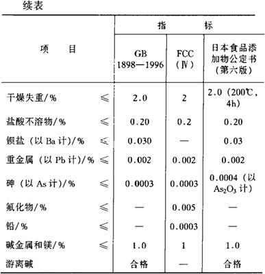 释义 | 碳酸钙(轻质碳酸钙) 别名 沉淀碳酸钙 编码 GB 06.003;INS 170(i) 化学结构 CaCO3 相对分子质量 100.09 性状 碳酸钙依粉末粒径大小不同,分为重质碳酸钙(30~50μm)、轻质碳酸钙(5μm)和胶体碳酸钙(0.03~0.05μm)三种,其他性状基本相同。本品为白色微晶粉末,无臭,无味。熔点825℃,分解变成二氧化碳和氧化钙。在空气中稳定,溶于稀乙酸、稀盐酸和稀硝酸,并产生二氧化碳。难溶于稀硫酸,几乎不溶于水和乙醇。若有铵盐或二氧化碳存在,可增大其在水中的溶解度。任何碱金属的氢氧化物的存在,均可降低其溶解度。 制法 (1)将二氧化碳通入石灰乳制成。 (2)由碳酸钠溶液与氯化钙溶液作用制得。 (3)由碳酸钠溶液与石灰水制取。 质量标准 鉴别方法 取本品1g,加水10mL及稀乙酸(1+3)7mL时,起泡溶解。将此溶液煮沸,加氨试液(取40mL液氨加水制成100mL)中和后,呈现钙盐反应。 1.钙盐反应 加草酸铵溶液(1+30)于钙盐的盐酸酸性溶液中,即生成白色沉淀。分离收集沉淀,加稀乙酸(1+20)不溶解,再加稀盐酸(1+3)沉淀溶解。 2.碳酸盐反应 参见碳酸氢钠鉴别方法。 毒理学依据 1.LD50 大鼠口服6450mg/kg(bw)。 2.GRAS FDA-21CFR 181.29,182.5191,184.1191,184.1409。 3.ADI 无需规定(FAO/WHO,1994)。 4.代谢 钙是机体经常需要补充的成分,摄入后只有部分转变为可溶性钙盐被吸收,参与机体代谢。 使用 膨松剂、面粉处理剂、抗结剂、酸度调节剂(碱剂)、营养强化剂、固化剂、胶基脱模剂。 1.使用注意事项 (1)本品作膨松剂使用时多与其他品种配合使用。 (2)碳酸钙在我国尚许可作为面粉处理剂使用。 (3)碳酸钙的含钙量为40%,作为钙营养强化剂使用时,按元素钙控制其强化量。碳酸钙颗粒越小越易吸收。 2.使用范围及使用量 (1)我国《食品添加剂使用卫生标准》(GB 2760-1996)规定:可在需添加膨松剂的各类食品中按生产需要适量使用。用于乳及乳制品按有关规定执行。此外尚可用作面粉改良剂,在面粉中的最大使用量为0.03g/kg。也可作胶姆糖的填充剂。 用作营养强化剂时,按我国《食品营养强化剂使用卫生标准》(GB 14880-94)规定:可用于谷类及其制品、饮料,每公斤使用量为4~8g,以元素钙计为1.6~3.2g/kg。 (2)FAO/WHO(1983)规定:用于可可粉及含糖可可粉、可可豆粉、可可块和可可油饼为50g/kg(单用或与氢氧化物、碳酸盐和碳酸氢盐合用,以无脂可可为基础,按K2CO3计);加工干酪为40g/kg(单用或与其他酸化剂,乳化剂合用,以无水物计);淡炼乳、甜炼乳、稀奶油为2g/kg(单用)、3g/kg(与其他稳定剂合用,以无水物计);奶粉、稀奶油为5g/kg(单用或与其他稳定剂合用,以无水物计);果酱和果冻为200mg/kg(单用或与其他凝固剂合用,以Ca计);用于以谷物为基料的婴幼儿食品、婴儿罐头食品,以及仅以物理方法防腐的葡萄汁与浓缩葡萄汁,按生产需要适量添加。 (3)实际使用参考: ①作为膨松剂多与其他成分组成复合膨松剂使用,如碳酸钙5%、碳酸氢钠35%、酒石酸氢钾10%、无水硫酸铝钾(烧明矾)33%、琥珀酸二钠2%、味精10%、食盐5%。 作为钙强化剂,除用于面包、面条等外,尚可用于婴幼儿食品等,使用量按钙计为3g/kg;强化固体饮料时,按钙计为20g/kg。 在生产肉糜制品使用水分保持剂聚磷酸盐改良品质时,最好添加钙剂以使钙、磷平衡,其添加量以钙计多为0.5%~1.5%。 ②本品尚可用于酒的脱酸、饴糖的中和、冰淇淋制造和酸法制葡萄糖。生产葡萄酒时,对酸度过高的果汁(1.5%以上),可用碳酸钙(或碳酸钾)除去部分酸。除去100L葡萄汁中0.1%的酸,须加66g碳酸钙。除酸可在发酵后进行。 |