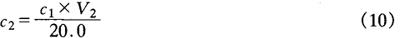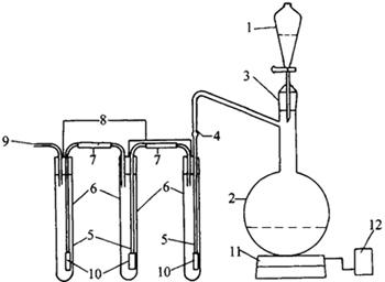 释义 | 碳酸饮料中二氧化碳的测定方法(摘自GB/T12143.4) (一)主题内容与适用范围 本标准规定了用蒸馏滴定法测定饮料中二氧化碳的方法。 本标准适用于碳酸饮料中二氧化碳的测定。 (二)原理 试样经强碱、强酸处理后加热蒸馏。逸出的二氧化碳用氢氧化钠吸收生成碳酸盐。用氯化钡沉淀碳酸盐,再用盐酸滴定剩余的氢氧化钠。根据盐酸的消耗量,计算样品中二氧化碳的含量。 (三)试剂 所用试剂均为分析纯,水为蒸馏水或同等纯度水(以下简称水)。 1.不含二氧化碳的水(须当天制备) 将水煮沸,蒸去原体积的1/5~1/4,迅速冷却。 2.酸性磷酸盐溶液 称取100g磷酸二氢钠(GB1267),溶于水中,加25mL磷酸(GB1282)转移至500mL容量瓶中。用水稀释至刻度。 3.氯化钡溶液 称取60g氯化钡(GB652),溶于1000mL水中,以酚酞-百里酚酞为指示液,用氢氧化钠标准滴定溶液和盐酸标准滴定溶液中和至中性。 4.10%过氧化氢溶液(临用时制备) 取10mL过氧化氢(GB2300),加20mL水。 5.酚酞-百里酚酞指示液 将1g酚酞与0.5g百里酚酞溶于100mL乙醇(GB679)中。 6.50%氢氧化钠溶液 称取500g氢氧化钠(GB629),溶解于500mL水中,贮存于塑料瓶中,静置15d。 7.0.25mol/L氢氧化钠标准滴定溶液的配制及标定 (1)配制 取13.5mL50%氢氧化钠溶液(6)的上层清液于1000mL容量瓶中,用不含二氧化碳的水(见上述1)稀释至刻度,摇匀。 (2)标定 称取约0.8g于105℃烘至恒重的苯二甲酸氢钾(GB1257),精确至0.0002g,溶于80mL不含二氧化碳的水中,加3滴(约0.15mL)酚酞-百里酚酞指示液,用氢氧化钠溶液滴定至溶液呈淡紫色。 计算:氢氧化钠标准滴定溶液的浓度按式(9)计算: 式中 c1——氢氧化钠标准滴定溶液之物质的量浓度,mol/L m——苯二甲酸氢钾的质量,g V1——滴定时消耗氢氧化钠标准滴定溶液的体积,mL 0.2042——与1.00mL氢氧化钠标准滴定溶液[c(NaOH)=1.000mol/L]相当的以克表示的苯二甲酸氢钾的质量。 8.0.25mol/L盐酸标准滴定溶液的制备及标定 (1)配制 取21.0mL的盐酸(GB622)于1.000mL容量瓶中,用水稀释至刻度,摇匀。 (2)标定 取20.0mL盐酸溶液于250mL锥形瓶中,加60mL不含二氧化碳的水和3滴酚酞-百里酚酞指示液,用0.25mol/L氢氧化钠标准滴定溶液滴定,近终点时加热锥形瓶内的溶液至80℃,继续滴定至溶液呈淡紫色。 计算:盐酸标准滴定溶液的浓度按式(10)计算: 式中 c2——盐酸标准滴定溶液之物质的量浓度,mol/L c1——氢氧化钠标准滴定溶液之物质的量浓度,mol/L V2——滴定时消耗氢氧化钠标准滴定溶液的体积,mL 20.0——滴定时取盐酸标准滴定溶液的体积,mL (四)仪器、设备 实验室常用仪器及下列各项: (1)二氧化碳蒸馏吸收装置 见图5-3-1。 图5-3-1 二氧化碳蒸馏吸收装置 1-100mL分液漏斗 2-500mL具支圆底烧瓶 3、8-橡皮塞 4-Φ14/15磨口 5-8mm的玻璃管 6-250mm×25mm试管 7-橡皮管 9-接真空泵 10-气体分散器(具有四个孔径为0.1mm一端封死的乳胶管) 11-电炉 12-调压器:1kW (2)台式真空泵或抽气管(伽氏)。 (3)真空表:量程1~100kPa(0~760mmHg)。 (4)冰箱或冰-盐水浴。 (5)分析天平:感量0.0001g。 (五)试液的制备 将未开盖的汽水放入0℃以下冰-盐水浴(或冰箱的冷冻室)中,浸泡1~2h,待瓶内汽水接近冰冻时(勿振摇)打开瓶盖,迅速加入50%氢氧化钠溶液的上层清液(每100mL汽水加2.0~2.5mL),立即用橡皮塞塞住。将瓶底向上,缓慢振摇数分钟后放至室温,待测定。 (六)分析步骤 1.试液的蒸馏-吸收 取15.00~25.00mL上述制备好的试液(二氧化碳含量在0.06~0.15g)于500mL具支圆底烧瓶中,加入3mL10%过氧化氢和几粒多孔瓷片,连接吸收管,将分液漏斗紧密接到烧瓶上,不得漏气。预先在第一及第二支吸收管中,分别准确加入20mL0.25mol/L氢氧化钠标准滴定溶液,并将二支吸收管浸泡在盛水的烧杯中。在蒸馏吸收过程中,温度控制在25℃以下。在第三支吸收管中准确加入10mL0.25mol/L氢氧化钠标准滴定溶液及10mL氯化钡溶液。将三支吸收管串联。第三支吸收管一端连接真空泵,使整个装置密封(见图5-3-1)。打开连接真空泵的阀门,缓慢增加真空度,控制在14~20kPa(100~150mmHg),直至无气泡通过吸收管。继续抽气,使其保持真空状态,将35mL酸性磷酸盐溶液加入分液漏斗中,打开活塞,使酸性磷酸盐溶液缓慢滴入烧瓶中(约30mL),关闭活塞。摇动烧瓶,使样品与酸液充分混合,用调压器控制电炉温度,缓慢加热,使二氧化碳逐渐逸出,控制吸收管中有断断续续气泡上升。待第一支吸收管中约增加2~3mL馏出液,吸收管上部手感温热时,即表明烧瓶内的二氧化碳已全部逸出,并被吸收管内氢氧化钠所吸收。此时关闭第三支吸收管与真空泵之间的连接阀,关闭电炉,慢慢打开分液漏斗的活塞,通入空气,使压力平衡。将三支吸收管中的溶液合并洗入500mL锥形瓶中,并用少量水多次洗涤吸收管,洗液并入锥形瓶中,加入50mL氯化钡溶液,充分振摇,放置片刻。 2.滴定 在上述锥形瓶中,加入3滴(约0.15mL)酚酞-百里酚酞指示液,用0.25mol/L盐酸标准滴定溶液滴定至溶液为无色。记录消耗盐酸标准滴定溶液的毫升数(V3)。 (七)分析结果表述 按式(3)计算样品中二氧化碳的含量,以质量百分率表示。 式中 x——样品中二氧化碳的含量,%(质量分数) c1——氢氧化钠标准滴定溶液之物质量的浓度,mol/L c2——盐酸标准滴定溶液之物质量的浓度,mol/L 50——加入三支吸收管中0.25mol/L氢氧化钠标准滴定溶液的体积,mL V3——滴定时消耗0.25mol/L盐酸标准滴定溶液的体积,mL V——蒸馏时取试液的体积,mL V4——每100mL汽水中加入50%氢