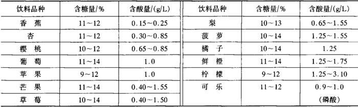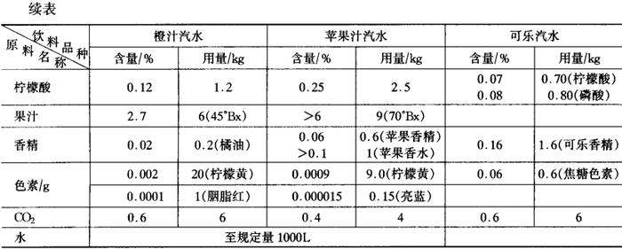 释义 | 碳酸饮料的配方设计 各种碳酸饮料的含糖量和含酸量参考量列于表2-3-5中,供生产试制不同饮料品种时参考,香精用量0.75~1.5g/L,含气量2.5~3.0容积倍数。 表2-3-5 主要碳酸饮料的糖酸含量 现以橙汁和苹果汁汽水为例,每1000L的配方设计及各种原料用量见表2-3-6。 表2-3-6 1000L饮料的配方 |