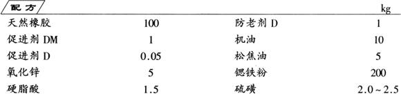 先将天然橡胶和促进剂DM、促进剂D混合,进行塑炼,再加入其余全部组分共同混炼、薄通,即得胶料。按磁性橡胶工艺要求成型,经硫化,制成磁性橡胶件。
