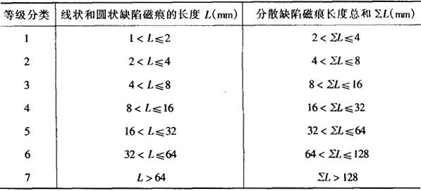 ZBJ04006-87标准对线状和圆状缺陷磁痕按其长度分为7级。分散缺陷磁痕,按面积2500mm2的矩形区域内,1mm以上缺陷长度总和也分为7级,见表4-49。