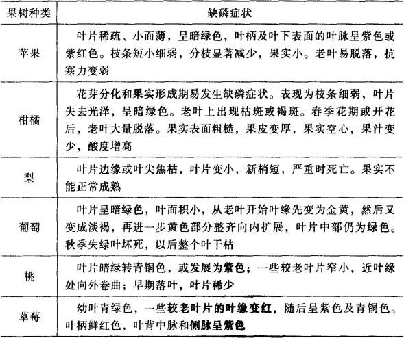1.缺磷素的症状 果树磷素供应不足,枝条纤细,生长减弱,侧枝少;展开的幼叶呈现暗绿色,叶片稀疏,叶小质地坚硬,幼叶下部的叶背面沿叶缘或中脉呈现紫色,叶与茎呈锐角;春天或夏天,生长迅速的部分呈紫红色;开花和坐果减少,春芽开放较晚,果实小,品质差。几种主要果树的缺磷症状见表3-38。