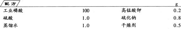 在启普发生器中加入硫化钠,漏斗中放入硫酸,并在洗涤瓶中装入蒸馏水,干燥瓶中放入干燥剂,连接好,并将气体出口通入磷酸容器中,把工业磷酸加热至(80℃±5℃),通入硫化氢至饱和。毕后,密闭放置,当沉淀完全后,用1号玻砂漏斗过滤,去除沉淀物。在不超过150℃的温度条件下,加热浓缩,并逐出硫化氢和氯化氢,即得纯化的磷酸。