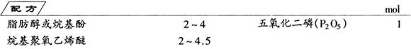 (2)烷基聚氧乙烯醚磷酸酯 在装有搅拌器及带有夹套的反应釜中加入脂肪醇或烷基酚,缓慢加入P2O5,P2O5与烷基聚氧乙烯醚的摩尔比为1∶(2~4.5)。在搅拌下把P2O5徐徐加入到烷基乙烯醚中。反应温度为30~50℃,反应时间1h。