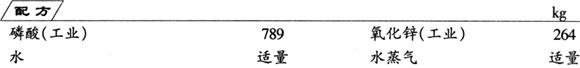 将工业磷酸打入母液贮槽中,与母液配制成15%~20%浓度的磷酸溶液。再打入磷酸高位槽中。将工业氧化锌打入预先装有水的带有夹套的不锈钢合成釜中。夹套通入蒸汽,开动搅拌打浆,使温度升至50~80℃。磷酸溶液由高位槽缓慢加入到合成釜中,可用pH试纸控制投料终点使之呈微酸性(pH=4)。夹套通入蒸汽可升温30~60℃。反应1.5~2h(在搅拌下),将料浆放入真空吸滤器中。料浆经分离、水洗,终点用pH试纸控制为中性。分离出的母液打入母液贮槽中,滤饼经烘干,即得成品。
