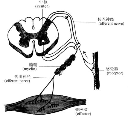 释义 | 神经调节 人体通过神经反射对各器官、组织、细胞的生理活动进行调节,称为神经调节。神经调节的基本方式是反射(reflex)。所谓反射,是指在中枢神经系统参与下机体对刺激发生的规律性反应。反射的结构基础是由感受器(receptor)、传入神经(afferent nerve)、神经中枢(nervous center)、传出神经(efferent nerve)、效应器(effector)等五部分组成的反射弧(reflex arc)(图4-15)。反射弧的任何一个部分遭到破坏,都会导致反射的消失。 图4-15 反射弧示意图 反射可分为非条件反射(unconditioned reflex)和条件反射(conditioned reflex)两种。前者是先天遗传的,反射弧相对较简单、固定,是维持动物的一些基本本能的活动。后者是后天学习获得的,是在非条件反射的基础上建立起来的反射。它是一种更加完善、灵活的反射,具有更加适应环境变化的生理意义。在整体调节过程中,神经调节起主导作用,具有迅速、准确、及时启动和及时终止反射的特点。 |