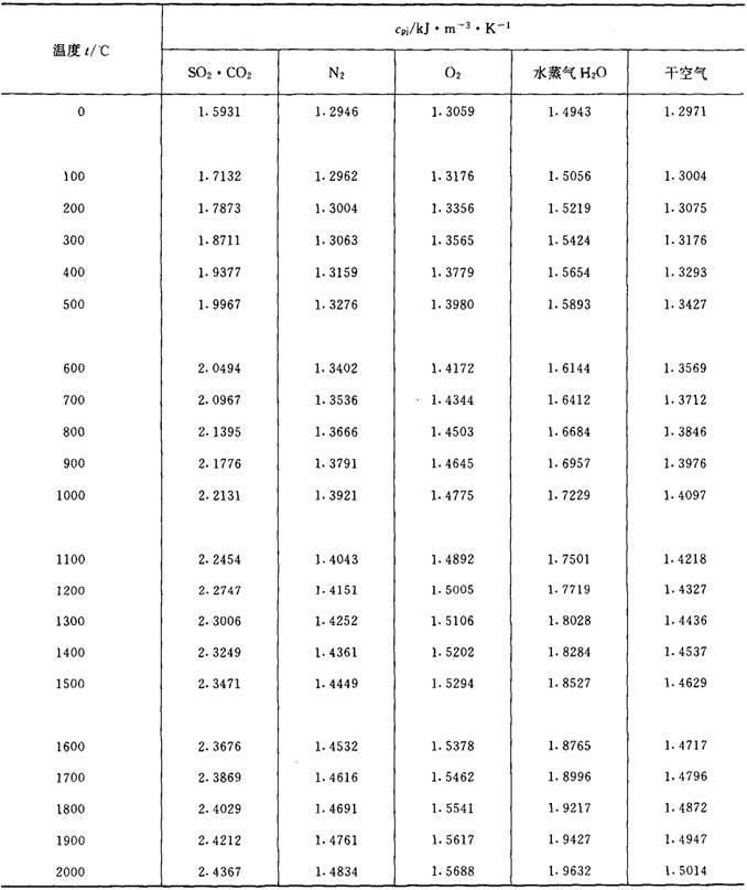 表1-2-26 在0~t℃温度范围内空气和各种气体的平均热容量cpj