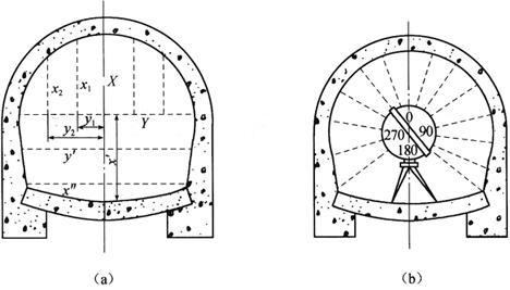 3)竣工测量要测绘纵断面和横断面图。纵断面沿中线方向测定底部和拱顶高程,每隔10~20m测定一点,绘制纵断面图,并套绘设计坡度线比较。隧道和硐室应测定横断面,直线隧道每隔10m、曲线隧道每隔5m测定一个断面。横断面测量可用支距法,测量时以中线为纵轴,起拱线为横轴,分别量出起拱线至拱顶的纵距和横距,还要量出起拱线和底部的纵距和到腰线的距离,如图12-21(a)所示。横断面测量也可采用极坐标法,如图12-21(b)所示。