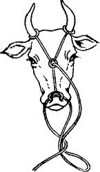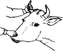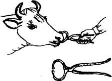 2.鼻钳保定法 鼻钳是兽医最常用的保定工具,其保定方法是用鼻钳拉住鼻(图3.1.2)。对烈性牛,用鼻钳尚不能控制时,可将牛缰绳双折,套于鼻钳或鼻环的基部,用力扭拧,即可控制(图3.1.3)。