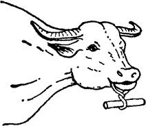 1.徒手保定法 术者站于牛颈部右侧,左手握牛右角,右手拍打牛的左眼,在牛不断眨眼或闭眼时,右手拇指和食指、中指趁机插入牛两鼻孔捏住鼻中隔,并用力提起拉向右侧。在提拉牛鼻的同时,捉牛角的左手用力前推,牛头因同时受到压、提、拉几种力量的作用,向左后方弯曲而被固定(图3.1.1)。