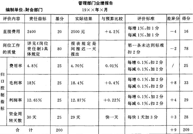 释义 | 管理部门责任中心的考核与评价 管理部门是指企业最高管理机构以及企业中专门从事财会、计划、人事、统计等方面工作的职能管理部门。管理部门是企业经营活动和决策者和组织者,它们的管理经验和管理能力与企业经营活动的整体效益息息相关,因此,责任会计在对从事商品的经营的各类责任中心进行业绩评价的同时,必须对企业最高管理机构和各职能部门的管理业绩进行评价。 一、确定评价的内容 管理业绩评价的内容是由各部门在企业管理大系统中的作用和担负的职责来确定的。各个管理层次和管理部门的工作内容以及不同层次和部门间工作内容的差别必须在业绩评价中得到充分体现。在相互联系、相互制约的管理关系链中,管理业绩评价内容只能在区分各部门职责的基础上,根据各部门的直接管理内容而定。例如,企业在进行劳动竞赛,遵守劳动纪律方面取得的突出成就虽然与财会部门业务部门的密切配合分不开,但劳动管理是人事部门归口管理的工作这一方面的工作只能作为劳动人事部门业绩评价的内容。各管理部门工作业绩评价的内容虽然存在着很大的差别,但大体上由以下三部分内容构成。 (一)费用预算控制的评价 由于各个管理部门在日常工作中只发生费用支出,而无直接收入,因此,每个管理部门都是一个费用中心,责任会计根据各部门业务范围的大小以及费用支出的多少确定各部门费用开支的标准,作为控制日常支出的依据。为了反映费用预算的执行情况,考核费用预算执行结果,责任会计必然要对各管理部门费用预算控制工作进行评价。 (二)岗位工作质量评价 费用预算控制虽然是各部门工作内容的组成部分,但并不是管理部门工作的目的。各管理部门应该以费用支出作为开展日常活动的基础,做好各个岗位的工作履行管理的职能。各岗位做好本职工作,是各部门提高管理工作效率的基础。岗位工作质量评价就是要以各岗位工作内容为核心进行业绩评价。例如,企业财会部门由出纳、审核制证、记帐等工作岗位组成,因此,对财会部门的管理业绩评价必须对上述岗位的工作质量进行评价。 (三)归口管理责任指标控制的评价 各职能部门具体履行某一方面的管理职能,归口管理指标是各职能部门专业管理具体内容的集中体现。对归口管理责任指标控制业绩的评价应该作为各职能管理部门业绩评价的重点,引进指标控制的效果如何直接关系到企业总体目标的实现。例如,企业财会部门主要从事整个企业的资金、成本、费用和利润的管理,因此,费用率、利润率、资金周转速度、毛利率等指标就应该成为评价财会部门管理业绩的主要内容。 二、确定评价标准和方法 管理部门的业绩评价既包括直接控制的营业预算指标,也包括归口控制的责任指标,既有经济效益方面的内容,也有工作质量方面的内容。因此,对管理部门的工作业绩评价应根据各部门评价内容的特点确定相应的评价标准和评价方法。 (一)价值方面的内容以预算指标为标准,利用日常核算资料进行业绩评价 对管理部门直接控制的费用预算指标以及归口控制的价值指标,应以下达的责任预算指标为评价的标准,利用本部门的核算资料以及汇总各经营单位责任会计报表所得的有关资料与责任预算指标相比较,评价价值指标控制方面的业绩。 (二)各管理岗位的工作质量以及归口管理的服务质量应确定具体标准,采用定期检查和民主评议的方法进行评价 管理部门归口管理服务质量的评价方法与各经营单位服务质量评价方法基本相同。管理部门的内部各岗位具体从事某一项管理工作,业绩评价应根据各岗位工作的性质确定具体的标准。例如,企业财会部门的记帐岗位工作是为了记帐凭证进行帐簿登记,并按规定编制各种会计报表,因此,对记帐岗位应制定相应工作要求并作为评价的依据,即按规定登记帐薄,及时编制各种报表,保证帐证、帐帐,帐表相符。由于各岗位工作内容较广、工作标准也不是唯一的,所以,各部门一般在各《岗位责任制》中具体制定评价标准。对各岗位制定出评价标准之后,应加强平时的监督和指导,并定期进行检查,用分值来具体体现各岗位的工作业绩。当然,各单位及职工对岗位工作的评价也是管理工作业绩评价的重要依据,业绩评价中应充分吸收各方面的意见。 三、管理部门业绩报告的编制 为了系统评价管理部门的工作业绩,应在确定管理部门业绩评价内容,评价标准及方法的基础上,定期(一般为每月末)编制管理部门业绩报告。现以财会部门为例说明管理部门业绩报告的编制,如图表4-11所示。 图表4-11 从财会部门编制的“管理部门业绩报告”中可以看出,财会部门19××年×月份管理责任指标都圆满完成了责任预算的规定。岗位工作除了报表编制不及时以外,其他方面均达到规定的要求,今后应加强报表编制环节的工作,做到及时编报各种报表,满足管理需要。财会部门存在的突出问题是对本部门直接费用控制不严使实际费用超预算100元,应该具体分析费用超预算的原因,并采用改进费用控制的具体措施努力降低管理费用支出。 |