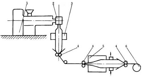 释义 | 管膜吹塑法双向拉伸薄膜 1.双向拉伸薄膜及其特性 薄膜的双向拉伸就是在熔点以下、玻璃化温度以上的温度范围内把未拉伸的薄膜或片材在纵、横两个方向上拉伸,使分子链或特定的结晶面与薄膜表面平行取向,然后在张紧的条件下进行热处理。拉伸薄膜改进了力学强度即提高了拉伸强度、拉伸弹性模量、撕裂强度、疲劳弯曲性等,并且改善了耐热性、耐寒性、透明性、光泽、透气性、防湿性、电绝缘性等。 双向拉伸薄膜在加热时,分子取向松弛,薄膜发生收缩,所以,又称为热收缩薄膜。用热收缩膜包装商品有这样几个特点: ①密封、防湿,对商品的保护性好。 ②薄膜紧贴商品,可显示商品的造型。 ③能均匀捆扎、固定商品,特别适用于多个商品的包装。 ④能包装一般方法难以包装的商品。 ⑤包装工艺、设备简单,有通用性,便于实现机械化包装。 ⑥节省了包装材料,减少包装体积。 因此,热收缩膜在包装业中应用相当广泛。热收缩塑料薄膜以PVC、PE为主要原料;其中PE热收缩膜产量最大,它具有如下几个特点: ①使用性能好。主要表现在:无毒、韧性和低温脆性比PVC、PP要好,热收缩率高,贮藏稳定性好。 ②生产工艺较简便。 ③厚度和幅宽的范围较大。 ④价格比较便宜。 双向拉伸薄膜的生产有两种方式:平膜法(见第八章)和管膜法。 RPVC热收缩薄膜执行ZBG3309-89;热收缩范围:纵向10%~30%;横向40%~60%。 2.生产工艺过程(管膜法) 管膜法PE热收缩薄膜的生产工艺有三种:一泡法、二泡法和辐射交联法。所谓一泡法就是只有一次吹胀,工艺流程与普通吹塑薄膜相同,所不同的只是吹胀比和牵引比都比较大。辐射交联法的工艺流程与第三节中“PE辐射交联热收缩套管”相同,所不同的只是厚度的区别。现简要介绍二泡法工艺。 二泡法工艺流程见图7-18。 图7-18 二泡法热收缩薄膜工艺流程图 1-挤出机 2-机头 3-水套 4-夹紧辊 5-加热箱 6-卷取 选用Φ45的挤出机,采用平挤下吹法,第一次的吹胀比1.2~1.5,第一次稍有拉伸。第一次吹胀后的膜管通过冷却水套,水温为15~20℃,待膜管冷却到40~50℃后,进入150℃左右的加热烘箱,同时吹胀和拉伸。纵向拉伸是由导入辊和牵引辊的速度差来实现的;横向拉伸是利用压缩空气将膜吹胀。吹胀比和拉伸比均为2.5左右。 |