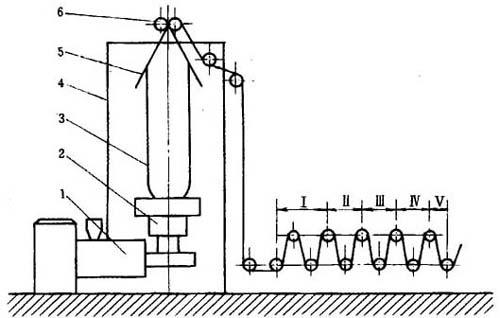 图7-17 管膜法单向拉伸HDPE扭结膜工艺流程示意图 1-挤出机 2-机头 3-管膜 4-支架 5-人字板 6-牵引辊 Ⅰ-预热辊 Ⅱ-拉伸辊 Ⅲ-定型辊Ⅳ-热处理辊 V-定型辊 原料为大庆产HDPE,牌号为PE-LALH-50D012,MFR为1.0g/10min。 机身和机头的温度控制采用平衡式温度较好,即从进料到机头的温度变化不大。具体温度见表7-8。 表7-8 机身与机头的温度数据 单位:℃