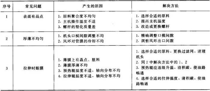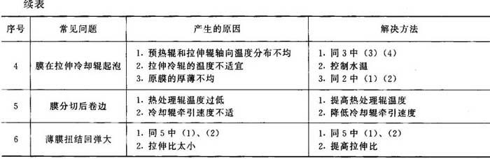 拉伸比控制在5.0~7.0之间。 管膜法单向拉伸HDPE扭结膜的生产常见问题及解决方法见表7-11。 表7-11 管膜法单向拉伸HDPE扭结膜的生产常见问题及解决办法