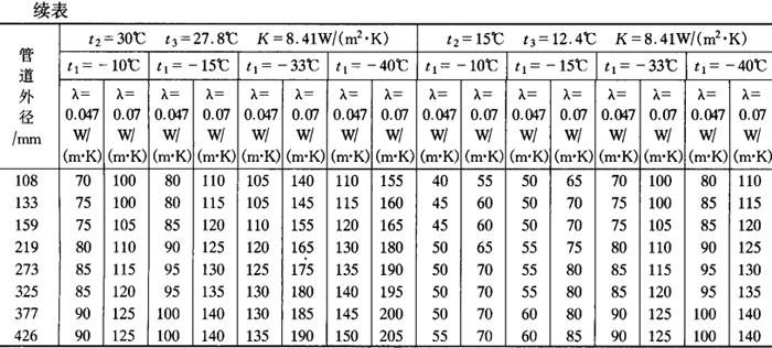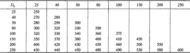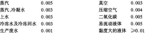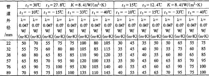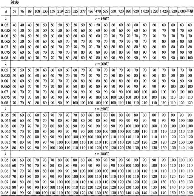 释义 | 管道安装 1.管道间距 管道并排、法兰错排时的管道间距,见表6-4-44。管道并排且阀的位置对齐时的管道间距见表6-4-45。 表6-4-44 管道并排、法兰错排时的管道间距 单位:mm 注:(1)不保温管与保温管相邻排列时,间距=(不保温管间距+保温管间距)/2。 (2)若系螺纹连接的管子,间距可按上表减去20mm。 (3)管沟中管壁与管壁之间的净距为160~180mm,壁管与沟壁之间的距离为200mm左右。 (4)表中A为不保温管,B为保温管,d为管子轴线离墙面的距离。 (5)本表适用于室内管道安装,不适用于室外长距离管道安装。 表6-4-45 管道并排且阀的位置对齐时的管道间距 单位:mm 注:适用于PN≤2.5MPa的管道。 2.管道留孔 管道穿楼板、屋顶及隔墙时,需在土建施工时预留孔,留孔大小对于螺纹连接的管为管外径加10mm;对于法兰和保温管为其法兰外径或保温管外径加10mm。 3.管道坡度 管道敷设应有一定坡度,以保证介质顺利地流通或排净。坡度一般均顺着介质流动方向,但也有与介质流动方向相反者。一般采用的管道坡度如下: 4.管道跨距 管道安装跨距根据管材许用应力来确定,一般易检查处取55MPa,不易检查处取17.5MPa。 饮料厂常用管道的支架跨矩可按表6-4-35钢管主要计算数值表内所列的管道支架跨距取值。 5.管道系统的试漏 管道安装完毕后,应对管道系统进行强度与严密性试验,一般采用液压进行。液压试验压力按表6-4-46的规定进行。 表6-4-46 液压试验压力 单位:MPa 在液压强度试验有困难时,可用气压试验代替,但必须采取有效的安全措施。对于≤300mm公称通径的管道,其试验压力一般不得超过1.6MPa。气压强度试验压力为设计压力的1.15倍,真空管道为0.2MPa。严密性试验压力按设计压力进行,但真空管道不小于0.1MPa。真空系统在严密性试验合格后,还应以设计压力进行真空度试验,时间为24h,增压率以不大于5%为合格。 6.管道的绝热 (1)管道绝热目的 ①减少管道的热(冷)量损失; ②保证操作人员安全,防止烫伤和减少热量散发到操作区; ③使管内介质在输送过程中不受外界温度的影响而改变介质的状态,致使生产受影响; ④防止因管内介质温度低于周围空气露点温度而致管道表面结露。 (2)饮料厂需绝热的管道 蒸汽管、热水管(50℃以上),冷凝水管、冷冻水管、氨液及氨气管、二氧化碳管、50℃以上和10℃以下的物料管道。 (3)绝热结构 绝热结构如下: (4)绝热材料选用要求 选用要求如下: ①保温材料在平均温度低于350℃时,导热系数不得大于0.12W/(m·℃);保冷材料在平均温度低于27℃时,导热系数应不大于0.064W/(m·℃)。 ②保温硬质材料密度一般不得大于300kg/m3,软质材料及半硬质制品密度不得大于220kg/m3;保冷材料密度不得大于220kg/m3。 ③耐振动硬质材料抗压强度不得小于0.4MPa;用于保冷的硬质材料抗压强度不得小于0.15MPa。 ④吸水率要小,保温材料的质量含水率不得大于7.5%;保冷材料的质量含水率不得大于1%。用于直埋管道的保温材料含水率应小于3%。 ⑤绝热层材料及其制品允许使用的最高或最低温度要高于或低于流体温度。材料应具有安全使用温度的性能和燃烧性能(不燃性、难燃性)。 (5)饮料厂常用的绝热层材料 见表6-4-47。 表6-4-47 常用绝热材料性能表 (6)保温厚度之选择 室内管道保温层厚度可参考表6-4-48,室内管道保冷层厚度可参考表6-4-49。 表6-4-48 室内管道保温层通用厚度表 单位:mm 注:λ为导热系数,单位为W/(m·℃)。 表6-4-49 室内管道保冷层厚度 单位:mm 注:t1-管道或设备内制冷剂(或盐水)的温度; t2-管道或设备周围空气的温度(一般常温地段应取夏季空调日平均温度℃); t3-保冷层外表温度(一般可按日平均温度下露点温度加1~2℃); K-保温层外表面传热系数(一般可取8.41W/m2·K)。 |