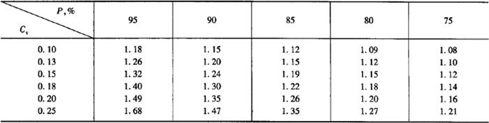 A、B——试验系数。当缺乏A、B试验系数时,可按下列数值取用。采用碎石时,A=0.46,B=0.52;采用卵石时,A=0.48,B=0.61(仅适用于骨料为干燥状态)。 ③根据骨料最大粒径及混凝土坍落度选用用水量(W0),可按表2-34选用。 表2-34 混凝土用水量 ④根据水灰比、粗骨料最大粒径及砂细度模数选用砂率,可按表2-35选用。 表2-35 混凝土砂率 ⑤水泥的用量(C0),应按下式计算: ⑥水泥浆的体积(Vp),应按下式计算: 式中 γc——水泥比重。 ⑦砂和石料的总体积(VA),应按下式计算: VA=1000(1-a)-Vp (2-19) 式中 a——混凝土含气量(%),不掺外加剂的混凝土,当骨料最大粒径为20mm时,可取2%;40mm时可取1%;80mm和150mm时可忽略不计。 ⑧砂料的重量(S0),应按下式计算: S0=VA·Qs·γs (2-20) 式中 γs——砂料比重; Qs——砂率,%。 ⑨石料的重量(G0),应按下式计算: G0=VA·(1-Qs)·γg (2-21) 式中 γg——石料比重。 2)根据混凝土结构设计要求的强度(R0)和强度保证率(P)及离差系数(Cv)的计算方法。 ①计算出要求的试配强度: 混凝土试配强度应等于设计强度(R0)乘以系数K,K值与混凝土强度保证率和离差系数有关,可按表2-36查得。 表2-36 K值表 表中P值根据结构物类型和重要性,由设计单位规定。 Cv值由混凝土施工质量水平决定,可预先选用。当混凝土强度在20MPa及以上时可选用0.15;在20MPa以下时可选用0.20。以后根据施工资料调整。Cv值应按下列方法计算: a.计算平均强度Rm(总体强度的特征值),指同一强度等级的混凝土若干组试件抗压强度的算术平均值,应按下列公式计算: 式中 Ri——每组试件的平均极限抗压强度; n——试件的组数。 b.混凝土强度的标准差σ0,应按下列公式计算: c.混凝土强度的离差系数Cv,应按下列公式计算: ②水灰比、用水量、砂率、水泥用量及砂料石料重量的计算或选用方法与上述“1)”中“②”至“⑨”的内容相同。 ③基准混凝土配合比各种材料用量为:C0、W0、S0、G0。 (2)等量取代法配合比计算方法 1)选定与基准混凝土相同或稍低的水灰比。 2)根据确定的粉煤灰等量取代水泥量(f%)和基准混凝土水泥用量(C0),应按下式计算粉煤灰用量(F)和粉煤灰混凝土中的水泥量(G): F=C0·f(%) (2-25) C=G0-F (2-26) 3)粉煤灰混凝土的用水量(W),应按下式计算: 4)水泥和粉煤灰的浆体体积(Vp),应按下式计算: 式中 γf——粉煤灰比重。 5)砂料和石料的总体积(VA),应按下式计算: VA=1000(1-a)-Vp (2-29) 6)选用与基准混凝土相同或稍低的砂率(Qs)、砂料(S)和石料(G)的重量,应按下式计算: S=VA·Qs·γs (2-30) G=VA·(1-Qs)·γg (2-31) 7)等量取代法粉煤灰混凝土配合比各种材料用量为:C、F、W、S、G。 (3)超量取代法配合比计算方法 1)根据基准混凝土计算出的各种材料用量(C0、W0、S0、G0),选取粉煤灰取代水泥率(f%)和超量系数(K),对各种材料进行计算调整。 2)粉煤灰取代水泥量(F)、总掺量(Ft)及超量部分重量(Fe),应按下式计算: F=C0·f(%) (2-32) Ft=K·F (2-33) Fe=(K-1)·F (2-34) 3)水泥的重量(C),应按下式计算: C=C0-F (2-35) 4)粉煤灰超量部分的体积应按下式计算,即在砂料中扣除同体积的砂重,求出调整后的砂重(Se): 5)超量取代粉煤灰混凝土的各种材料用量为:C、Ft、Se、W0,G0。 (4)外加法配合比计算方法 1)根据基准混凝土计算出的各种材料用量(C0、W0、S0、G0),选定外加粉煤灰掺入率(fm%),对各种材料进行计算调整。 2)外加粉煤灰的重量(Fm),应按下式计算: Fm=G0·fm(%) (2-37) 3)外加粉煤灰的体积,应按下式计算,即在砂料中扣除同体积的砂重,求出调整后的砂重(Sm): 4)外加粉煤灰混凝土的各种材料用量为:C0、Fm、Sm、W0、G0。 |