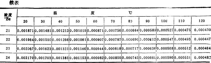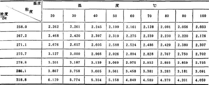溶液中含单盐时,在浓度、温度相同情况下,相对粘度顺序为:MgSO4>MgCl2>CaCl2>NaCl>KCl。表2-1-29和表2-1-30分别为海水、卤水的粘度和相对粘度。表2-1-31和表2-1-32分别为苦卤的粘度和相对粘度。