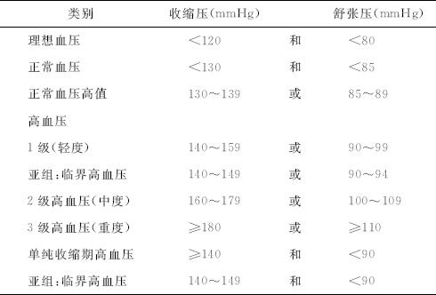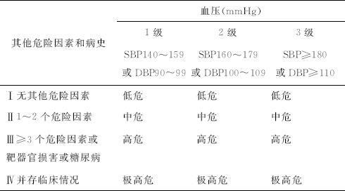 收缩压与舒张压属不同级别者,应按两者中较高的级别分类。患者既往有高血压病史,目前已服抗高血压药,血压虽已低于140/90mmHg,也应诊断为高血压。 2.高血压的危险因素及危险分层 家族史、高血糖、高甘油三酯、超重(肥胖)、钠盐摄入过高、多饮酒、膳食中钾、钙减少会加重高钠影响,是其危险因素,而业余锻炼是其保护因素。近年日本、中国、美国研究表明,膳食中增加鱼或其他动物蛋白质可使血压下降。1999年WHO/ISH高血压指南,不再强调过去的高血压分期,而突出血压水平与心血管事件发生的危险性之间有连续相关性,根据高血压程度(1、2、3级)和有无危险因素、靶器官损害和患者的相关临床情况进行综合评估,将其预后做了危险分层,见表16-2。3级高血压或有3个危险因素或出现糖尿病者将被列入高危险期和极高危险层次,而若出现相关临床情况[心血管疾病和(或)肾脏病变],则已进入极高危分层,提示预后不良。 表16-2 按危险分层、量化地估计预后