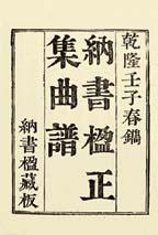 释义 | 纳书楹曲谱(曲qǔ) 戏曲曲谱。 清叶堂编。正编、续编、补遗、外集共十四卷,收乾隆时舞台上流行的昆剧以及一小部分地方戏折子戏剧本共三百余出;又《玉茗堂四梦》曲谱八卷,《西厢记》曲谱二卷。均收曲词而未附科白,注有比较详细的工尺、板眼。 《纳书楹曲谱》书影 |