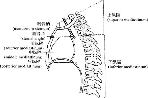 释义 | 纵隔 纵隔(mediastinum)是左右纵隔胸膜间所有器官结构的总称,其前界为胸骨,后界为脊柱胸段,两侧为纵隔胸膜,向上达胸廓上口,向下至膈。通常以胸骨角平面(平对第4胸椎体下缘)将纵隔分为上纵隔(superior mediastinum)与下纵隔(inferior mediastinum),下纵隔再以心包为界,分为前纵隔(anterior mediastinum)、中纵隔(middle mediastinum)和后纵隔(posterior mediastinum)(图7-23)。纵隔内主要器官有胸腺、心包和心脏、心脏出入口的大血管、食管、气管、支气管、迷走神经、交感干、胸导管、奇静脉、淋巴结、膈神经、心包隔血管及连接组织等。由于小儿纵隔较成人相对地大,柔软而富有弹性,且其周围组织松软而疏松,再加上小儿胸膜较薄,胸膜囊大于肺脏而有贮备空间(窦),所以胸膜腔有较大量积液时,常易引起纵隔器官的移位。 图7-23 纵隔分区示意图 由于心脏的正常位置偏左,故成人的纵隔位置也明显偏左,正常情况下两侧胸膜腔的压力相等,纵隔位置相对固定。其活动无论是向前、向后和向两侧均在保证正常呼吸容许的范围内。如果由于外伤或其他原因引起气胸(pneumatothorax)、血胸(hemathorax)或脓胸(pyothorax)而致一侧胸膜腔压力增大时,纵隔将被推向对侧;相反,如一侧胸膜腔高度纤维瘢痕纤维性收缩时纵隔则被牵拉向患侧。由于纵隔器官众多且排列紧密,一旦发生占位性病变,必然挤压相邻器官而产生许多临床症状。因此纵隔是一个具有重要实用意义的解剖部位。 |