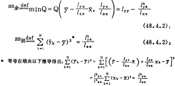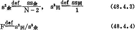 x-y平面上的直线(48.4.1)1式称为总体族的一元回归直线。必须注意到(48。4.1)1式与(48.3.1)1式在概念上的差别,它们分别称为“因子回归”与“相关回归”。 一元(因子)回归的调查和实验方案是{N;xk,k=1—N;n},表示数量因子x取N个值,这N个值是xk,k=1—N(不妨设为从小到大的次序排列),对应于每一个xk的总体Yk的样本观测值是n个同质数据yki,i=1—n。本章只研究n=1的情形(1),借用二元总体的样本观测值的格式: β0、β和一元回归直线(48.4.1)1式的最小二乘估计跟(48。3.1)2式在形式上一样: