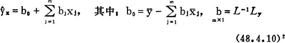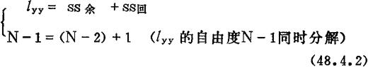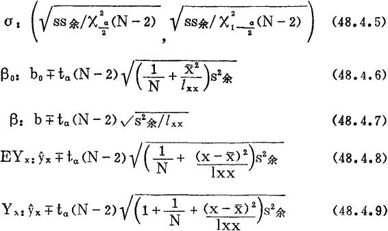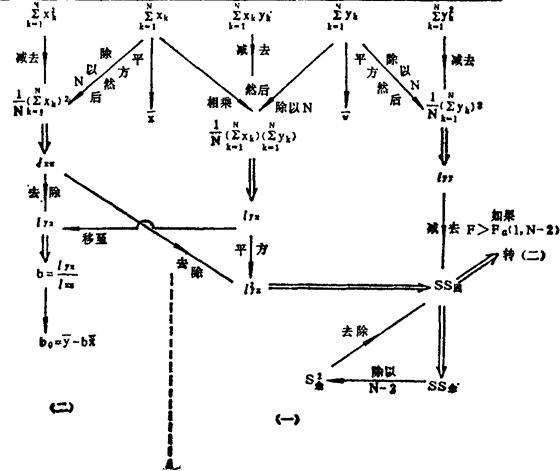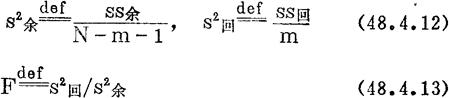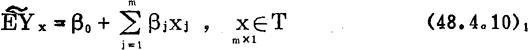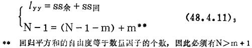直线(48。4.1)2式通过点( 定义下列剩余平方和与回归平方和: 由以上二式可知: 产生差异平方和lyy的原因,除了随机因素而外,主要是由于N个总体Yk(n=1的样本)的观测值yk,k=1—N分别在因子x的N个取值xk,k=1—N条件下产生。lyy是N个非同质数据yk,k=1—N与其平均 为 需要定义下列方差以及F: 如果F>Fα(1,N-2),则推断β 表48—2 如果使用SHARP-5002计算器,则: 上述的线性回归分析以总体方差DYx≡σ2,即不随x∈T改变为前提。下面写出总体标准差σ与β0、β、EYx的1-α置信区间以及总体Yx的1-α取值区间: X 对于依赖于m个数量因子的总体族{ 把样本观测值与数量因子 总体族的平均数EYx的线性模拟: 由 假设系数阵 线性模拟(48.4.10)1式的最小二乘估计(3)是: 定义下列剩余平方和与回归平方和: 由以上二式可知; 按(48.4.10)2式求得线性模拟(48.4.10)1式的最小二乘估计的前提是下列的F>Fα(m,N—m—1): 简单介绍正交回归设计:采用正交表使可以人为控制的m个数量因子的取值两两全面搭配,从而正规方程的系数阵成为对角阵,回归平方和也成为简单的∑求和,在形式上是一元线性的b= (编者:刘长安 审者:孙尽善) |