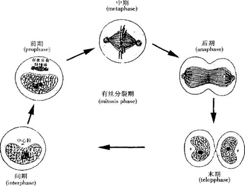 释义 | 细胞增殖 一个细胞分裂成为两个新细胞的过程,称为细胞增殖(cell generation)。细胞通过分裂增殖产生新的细胞,使人体能够生长、发育和补偿因创伤或衰老而死亡的细胞。细胞从前一次分裂结束起到下一次分裂结束为止所经历的过程,称细胞增殖周期(cell generation cycle),简称细胞周期(cell cycle)。细胞周期可分为间期(intcrphase)和有丝分裂期(mitosis phase)(图2-4)。 图2-4 细胞增殖周期示意图 (一)间期 间期是指细胞两次分裂之间的时期,可分为三个阶段。细胞在有丝分裂结束后,就开始第一个生长阶段,称G1期,此期为DNA合成前期。接着是DNA合成的阶段,称S期,此期DNA复制,DNA含量增加一倍。如果DNA复制受到障碍或发生错误,就会抑制细胞的分裂或引起变异,导致形成异常细胞。某些化疗药物就是专门作用于S期,干扰或阻断肿瘤细胞中DNA的合成。如:5-氟尿嘧啶能使DNA合成发生障碍;环磷酰胺能破坏DNA的结构,故对S期有强烈抑制作用。细胞第二个生长阶段,称G2期,即DNA合成后期,此时DNA的合成已终止,但有少量RNA和组蛋白合成。 (二)有丝分裂期 有丝分裂是最普通的分裂方式,由于在分裂过程中,光镜下可见细丝,故称有丝分裂。在分裂过程中将S期中倍增的遗传物质(DNA)形成染色体,然后再平均分配到两个子细胞中。有丝分裂期简称M期。此期是一个连续的动态变化过程,一般分为四期。 1.前期(prophase) 中心粒分裂为二,染色质由细丝状缩短变粗成为染色体,接着每个染色体纵裂为两个染色单体(chromatid),两者仅在着丝点相连。核膜和核仁消失,已复制的中心粒分别向细胞两极移动,同时中心粒周围出现纺锤丝,形成纺锤体(spindle)。 2.中期(metaphase) 中心粒分别移到细胞两极。每一条染色体分别与两极中心粒发出的纺锤丝相连。并将染色体牵拉排列在赤道板上。 3.后期(anaphase) 姐妹染色体单体分开,它们被纺锤丝牵拉彼此分离向两极移动,同时细胞膜在赤道板部开始凹陷将形成子细胞的细胞膜。 4.末期(telophase) 染色体逐渐恢复为染色质,核仁、核膜重新出现,细胞凹陷处继续加深,最后完全断离为两个新的子细胞。 整个细胞周期是一个动态过程,互相联系不可分割,若某个阶段受到干扰时,细胞的增殖则发生障碍。临床上各种抗癌药物,就是根据细胞增殖各阶段不同特点,对癌细胞繁殖各期产生不同的效应,如放线菌D(actinomycin D)能抑制蛋白质合成,对G1及G2期有明显抑制效果;5-氟尿嘧啶(5-fluorouracil,5-Fu)能使DNA合成发生障碍;环磷酰胺(cyclophosphamide)能破坏DNA的结构,故对S期有强烈抑制作用,使之不能复制,导致细胞分裂停止或死亡。此外,长春花碱(vincaleukoblastine)及秋水仙碱(colchicine)可阻止纺锤体形成,从而抑制癌细胞分裂。故利用各种抗癌药物的不同作用,配伍使用以提高抗癌效果。因此熟悉细胞周期的理论对医药临床实践有着重要指导意义。 |