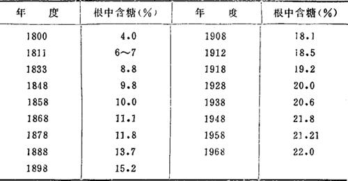 蔗糖是维持人类正常营养的碳水化合物之一,是供给人体能量的源泉之一(表1-1、表1-2)。糖用甜菜是世界和我国制糖的主要原料,是重要的经济作物,在亚寒带地区广泛栽培(图1-7及图1-8)。世界甜菜根中糖分的增长情况见表1-3。