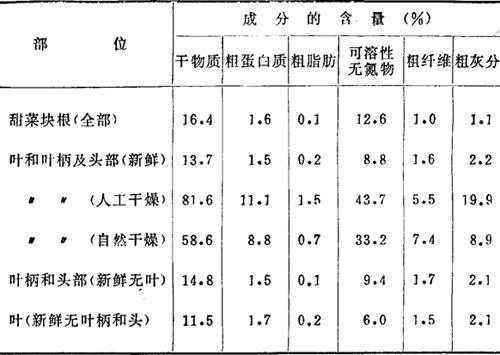 一般情况下每产一吨甜菜块根,还可生产甜菜茎叶700公斤,加上压粕约为一千公斤优质饲料,相当于100公斤饲料粮,可供一口猪一年的饲用量。有关块根各部及茎叶的成分见表1-4及1-5,甜菜废粕的成分见表7-7。