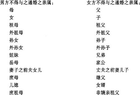 法律禁止一定范围的血亲结婚,是道德及优生的要求。现代任何国家都禁止一定范围内的血亲结婚,只是在禁止的范围上宽严不等,香港婚姻制度规定的禁止结婚的亲属关系是直系血亲及三等亲以内的旁系血亲,只有在此限之外的亲属关系才可结婚,香港禁婚亲属如下: