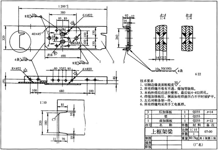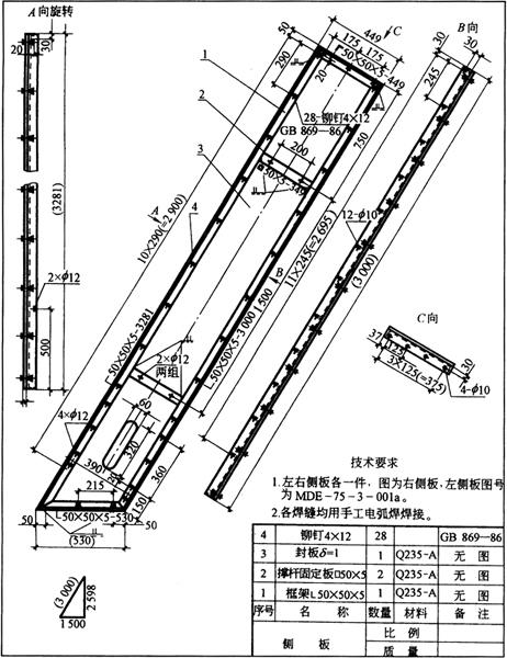 释义 | 结构图绘制举例 (一)上框架梁的金属结构图 图4-20所示为矿用电梯的上框架梁,由主体槽钢和前后两块加强板组成,并用焊条电弧焊焊接和铆钉连接共同拼装而成。 图4-20 上框架梁金属结构 由于梁要承受较大的载荷,拼装时增加了承载能力强的加强板;为保证加强板与槽钢之间的焊接强度达到规定的设计要求,又在前、后加强板上各加工了两个 在主视图和局部放大图(1∶10)上标有槽钢的规格尺寸和“ 在主视图上的焊缝代号“8处8处 在主、俯视图之间的焊缝代号“4条4条 在左视图上的焊缝代号“ 主视图上的“8处8处 此外,在三个视图上还表明了直径大小不等的三种连接孔的尺寸、加工要求及其分布和相对位置。 (二)侧板金属结构图 图4-21为侧板金属结构图,由4根长度分别3281mm、3000mm、530mm和449mm的等边角钢( 图4-21 侧板金属结构 在两个视图中多处有符号“ |