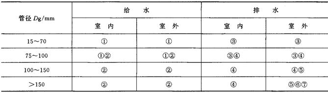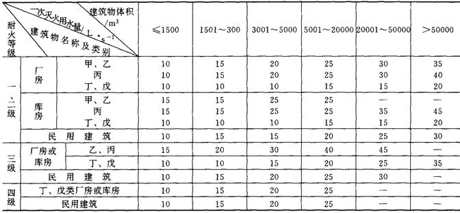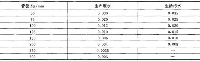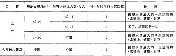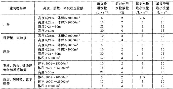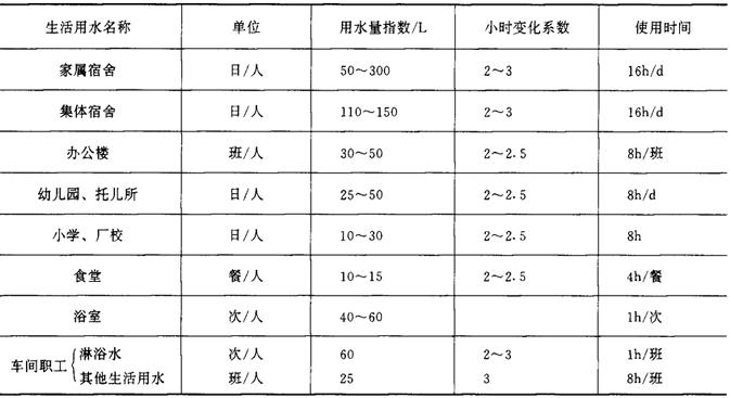 释义 | 给水与排水 (一)给水一般规定 (1)生产用水及生活用水应达到国家规定的生活饮用水标准。厂区室外和室内给水管网有条件时宜采用生产、生活、消防合并的系统。 应有两根同管径的给水总管进入厂区,每根给水总管均应满足全厂生产、生活、消防用水要求。进入主厂房、仓库的给水管不宜少于两根,其中应有二根给水管分别满足其用水量的总和。 (2)厂区主厂房、仓库及烟叶露天堆场周围的给水管应形成环管。多层主厂房、多层仓库的顶层给水管宜形成环网。 (3)用水应提高复用系数。空调、真空回潮机、真空泵、空气压缩机等的冷却水均应循环利用。当循环量大于400m2/h时,应进行水质稳定处理。进厂区的给水管应设总计量装置。生产车间、锅炉房、食堂、浴室等用水点均应设计量装置。 (4)生产车间内的给水管应进行防结露计算,并采取相应措施。 (二)全厂用水量计算 (1)锅炉房用水量计算: W=K1K2Q 式中W——锅炉房最大小时用水量,t/h; K1——蒸发量系数,一般取1.15; K2——锅炉房的其他用水系数,一般取1.25~1.35; Q——锅炉蒸发量,t/h。 (2)冷却塔循环用水量计算: 式中Wl——冷却塔循环水量,t/h; η——使用系数,一般取1.1~1.15; Ql——冷凝器负荷,kJ/h; t2——冷凝器出水温度(即冷却塔进水温度),℃; t1——冷凝器进水温度(即冷却塔出水温度),℃。 一般情况下t2≤36℃,t1≤32℃(随地区与季节而异)。 (3)汽车冲洗用水。 汽车的冲洗用水量及冲洗时间见表10-3-14。 表10-3-14 汽车的冲洗水量及冲洗时间表 计算汽车冲洗用水量时,应考虑同时冲洗系数,其值见表10-3-15。 表10-3-15 汽车冲洗时间的同时冲洗系数 (4)生活用水计算。生活用水量的多少与当地气候、人们的生活习惯以及卫生设备的完备程度有关,可根据当地类似企业或居民的生活用水量来确定;也可直接查表10-3-16后再用下列公式进行计算。 式中W——最大小时生活用水量,t/h; K——小时变化系数(见表10-3-16); Q——用水量指数(见表10-3-16); N——使用人数,人; t——使用时间(见表10-3-16)。 (5)消防用水计算。 表10-3-16 各种生活用水计算参数 注:浴室人数按最大班次工作人数的58%计。 ①室外消防用水量。工厂、仓库和民用建筑的室外消防用水量,应按同一时间内的火灾次数和一次灭火用水量确定。 工厂、仓库和民用建筑在同一时间内的火灾次数不应小于表10-3-17的规定。 表10-3-17 同一时间内的火灾次数表 注:采矿、选矿等工业企业,如各分散基地有单独的消防给水系统时,可分别计算。 建筑物的室外消防栓用水量,不应小于表10-3-18的规定;一个单位内有泡沫设备、带架水枪、自动喷水灭火设备,以及其他消防用水设备时,其消防用水量,应将上述设备所需的全部消防用水量加上表10-3-18规定的室外消防栓用水量的50%,但采用的水量不应小于表10-3-18的规定。 表10-3-18 建筑物的室外消火栓用水量 注:1.室外消防栓用水量应按消防需水量最大的一座建筑物或一个防火分区计算。成组布置的建筑物应按消防需水量较大的相邻两座计算。 2.火车站、码头和机场的中转库房,其室外消防栓用水量应按相应耐火等级的丙类物品库房确定。 3.国家级文物保护单位的重点砖木、木结构的建筑物室外消防用水量,按三级耐火等级民用建筑物消防用水量确定。 ②室内消防用水量。建筑物内设有消防栓、自动喷水灭火设备时,其室内消防用水量应按需要同时开启的上述设备用水量之和计算。室内消防栓用水量应根据同时使用水枪数量和室内消防栓用水量和充实水柱长度,由计算决定,但不应小于表10-3-19的规定。 表10-3-19 室内消防栓用水量 注:1.丁、戊类高层工业建筑室内消防栓的用水量可按本表减少10L/s,同时使用水枪数量可按本表减少2支。 2.增设消防水喉设备,可不计入消防用水量。 ③消防时全厂总用量。 a.用高压消防系统时总用水量按下列计算: W=W1+W2+W3 式中W——消防时全厂总用水量,t/h; W1——生产用水量总和,t/h; W2——生活用水量总和(消防时,淋浴用水量以原淋浴水量的15%计,清洗设备水量可不计入),t/h; W3——室内外消防用水量,t/h。 b.采用低压消防系统时:如果不致引起爆炸事故,而且除消防以外的总用水量大于室内外消防用水量时,总用水量可不计消防用水量;当除消防以外的总用水量小于室内外消防用水量时,总用水量为消防用水量和锅炉房用水量之和。 ④消防用水的压力。室外消防系统:当采用高压给水系统消防时,管道内的压力应保证消防用水量达到最大,且水枪布置在任何位置的最高处,水枪充实水柱仍不小于10m;当采用低压给水系统消防时,管道内的压力应保证在灭火时不小于10m水柱。室内消防系统:管道内的压力应保证水枪出口充实水柱不小于10m。 (6)生产设备用水量,见设备样本。 (7)给水系统。 ①自来水给水系统见图10-3-2。 图10-3-2 自来水给水系统图 ②地下水给水系统见图10-3-3。 图10-3-3 地下水给水系统图 ③地面水给水系统见图10-3-4。 图10-3-4 地面水给水系统图 (8)管径的确定和水泵的选择。 ①管径的确定。管道的计算利用图10-3-5进行。 图10-3-5 水在直管(铸铁管,钢管)中流量、管径、流速、压力降关系图 ②水泵的选择。一般总用水量50~500m3/h,所需扬程一般20~50m,国产BA型和SH型离心水泵均能满足要求。若采用地下水为水源,则可采用J型、JD型、JQ型或SD型深井泵。 在计算确定最大和平均小时用水量