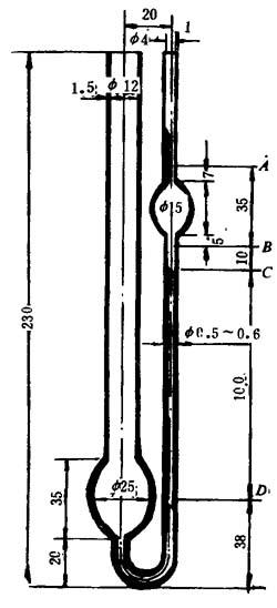 粘对粘度的测定要点是将树脂配成1%的二氯乙烷混合液,在80~85℃水浴中溶解,补足损失之二氯乙烷后注入事先已测常数K值的奥氏粘度计中,于20±0.1℃水浴中测诱液流经两刻度之时间。见图10-1-1。