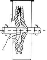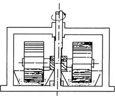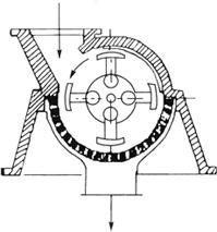 释义 | 绞碎与斩拌设备 绞碎(粉碎)与斩拌的设备种类很多,最普通的分类方法是按被绞碎(粉碎)物料的大小以及所得成品的粒度而分为粗碎、中碎、细碎设备,研磨设备和切割碎裂设备。粗碎设备有颚式压碎机、回转压碎机等重型设备,在食品生产上并不常见。食品加工中常见的中、细碎设备有滚筒轧碎机、锤式粉碎机、盘击式粉碎机等;研磨设备有盘式磨碎机、盘磨、辊磨机、胶体磨等;切割碎裂设备则有绞肉机、斩拌机、切片机、切丁机、锯割机、撕碎机等。 (一)中碎、细碎设备 1.滚筒轧碎机 滚筒轧碎机是利用一只或一只以上滚筒的旋转进行轧碎操作的设备,应用于中碎或细碎,最普通的是双滚筒轧碎机。双滚筒的设备系由直径相同的两个滚筒所构成,安装在平行的水平轴上。操作时,两滚筒旋转方向相反,物料从上部两滚筒之间加入,被其间的摩擦力所挟持而拖曳至下方,同时受到挤压力而被粉碎,从下方落下。 2.锤式粉碎机和盘式粉碎机 锤式粉碎机(图2-2-3)应用于中间粉碎,适用于中等硬度和脆性物料,但也能用于较软、较韧物料和纤维物料。其粉碎力主要为冲击力,也有摩擦力。锤式粉碎机的主轴上装有几个钢质圆盘,盘上又装有硬钢锤头。当锤头以40~100m/s的圆周速度高速旋转时,就以很大的力量撞击物料使之粉碎。经粉碎后的物料,从装在机壳上的格栅缝隙间卸出,并且可以调节缝隙以限定一定的粉碎比。 图2-2-3 锤式粉碎机 锤式粉碎机的锤头除以铰链连接于转动件外,也有刚性联结于转动件者。锤头有各种式样,有矩形断面的锤棒,有较薄的锤片,有的锤片很薄就成为刀状。锤头的安放位置有垂直于主轴或平行于主轴的。锤式粉碎机的机壳内面通常是平滑的,但也有具有一定的形状的,可使物料与机壳发生撞击而粉碎。锤式粉碎机机壳下部有格栅或筛网时,锤头与格栅之间的物料就受到很大的摩擦。格栅或筛网的孔缝大小决定了制品粒度的上限而非下限。格栅或筛网适用于非常干燥的制品或者含水分高的制品,对于中间状态的制品,则易被堵塞,不宜使用。 锤式粉碎机在食品工业中使用广泛,多用于处理结晶固体、纤维质物料、植物性物质、胶黏性的物料等,例如胡椒、花椒与香料等的粉碎。 此外,盘击式粉碎机的使用也非常广泛。其最简单的形式是由互相靠近的两个圆盘组成,每个圆盘上有很多以同心圆排列的齿状、针状或棒状的指爪,而且一个圆盘上的每层指爪伸入到另一圆盘的两层指爪之间。这样,当两个圆盘做相对运动时,除了指爪对物料的冲击粉碎力之外,还产生分割或拉碎的作用,所以适于纤维质物料的粉碎。一般盘击式粉碎机沿整个机壳周边安有筛网。 盘击式粉碎机有两种形式,其一仅一盘转动,另一盘为固定;另一则两盘均转动,可参见图2-2-4。 图2-2-4 盘击式粉碎机 近代盘击式粉碎机的形式颇多,指爪的形状各不相同,有短的或长的圆柱状,或甚至形成似刀齿。有的盘击式粉碎机其内层指爪形状及其相互距离与外层不同,目的是使物料因离心力作用向外周移动过程中产生逐级粉碎的作用。盘击式粉碎机有采用高速的倾向,如图2-2-4(1)的形式,其外层指爪圆周速度可高达160m/s。这种形式的粉碎机不带筛网,物料经粉碎机靠空气流带动。 两盘都转动的粉碎机,其圆盘转动可同向而转速不等,或依相反方向转动。这种粉碎机转速很高。最新式的还装有内部气流分级装置。最近还出现转动件之间距离可调节的盘击式粉碎机。 图2-2-4(2)所示为另一种不同的盘击式粉碎机,称为鼠笼式碎解机。它的主要构件是两只粉碎转动件,每只都由若干个有长指爪组成的笼所构成。同心的指爪层一侧固定在金属板上,另一侧装在圆环上。两笼依相反方向旋转,相对速度约为60m/s。这种设备具有强烈的撕碎作用,颇适于较韧纤维质食品的粉碎。 (二)研磨设备 研磨设备是一类利用摩擦力或剪力作为主要破碎力,将物料碎裂成更细的一种设备。因为许多食品要求颗粒很细,有的则要求达到超微细程度,所以研磨机和胶体磨是食品生产中广泛应用的设备。这里仅讨论一般的研磨设备,胶体磨还具有乳化作用,故放在第三节乳化中讨论。 1.盘式磨碎机和盘磨 盘式磨碎机是物料在两盘面之间依靠摩擦力的作用而碎裂为极细粉粒的绞碎(粉碎)机。一般除摩擦力外还有压力的作用。这种设备中摩擦力和挤压力两种作用力之间的关系,一方面取决于两盘面间的压力,另一方面取决于两盘面的速度差。 一般而言,盘式磨碎机适用于软性以至于极软物料的极细碎裂。另外,至少在原则上适合于一切韧性和纤维质物料的干磨和湿磨,且常用于湿物料的加工。 盘式磨碎机为轴向进料,进入的物料在两盘间沿径向通过。通常两盘中一盘不动,而另一盘则转动,但也有两盘都转动的。盘间距离是可调节的。图2-2-5所示为两盘都转动的型式。 图2-2-5 盘式磨碎机 食品工业上经常使用的盘磨(图2-2-6)是由磨盘与两个碾轮所组成。但碾轮绕着立轴和本身的横轴转动时,物料就在碾轮与磨盘之间借挤压和研磨力而被碾碎。 图2-2-6 盘磨 盘磨有两种形式。一种是碾轮转动而磨盘不动,即图2-2-6所示的一种。另一种是磨盘转动而碾轮对立轴并不转动。后一种的优点:①比较容易固定碾轮,操作稳定;②比较容易卸出碾碎后的物料;③在碾轮上没有离心力的作用。 2.辊磨机 辊磨机与滚筒轧碎机在构造和原理