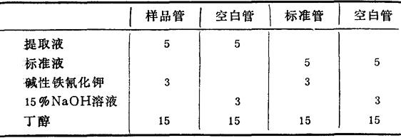 释义 | 维生素B1的测定 维生素B1(硫胺素,抗神经炎素),其测定方法有荧光计法和荧光目测法两种。 方法一:荧光计法测定维生素B1 维生素B1在碱性铁氰化钾溶液中可被氧化生成一种蓝色荧光物质——硫色素。在标准情况下,如果不存在其他荧光物质,溶液的荧光强度与硫胺素的浓度成正比。如果样品中含杂质过多,应经离子交换剂处理,使硫胺素与杂质分开。 试剂 (1)无水硫酸钠。 (2)15%氢氧化钠溶液:称15克氢氧化钠溶于蒸馏水中,稀释至100毫升。 (3)1%铁氰化钾溶液:1克铁氰化钾溶解于蒸馏水,定容至100毫升,置棕色瓶中,冰箱保存。 (4)碱性铁氰化钾溶液:取1毫升1%铁氰化钾溶液,用15%氢氧化钠溶液稀释至15毫升,临用前配制,避光存放。 (5)0.1N硫酸溶液:取2.8毫升浓硫酸(比重1.84)定容至1000毫升。 (6)0.1N盐酸溶液:取8.5毫升浓盐酸(比重1.19)用蒸馏水定容至1000毫升。 (7)2.5M醋酸钠溶液:称205克无水醋酸钠以蒸馏水溶解,定容至1000毫升。 (8)丁醇:114℃~118℃重蒸丁醇,也可用异丁醇。 (9)淀粉酶溶液:用淀粉酶制剂临用前配成2%的酶溶液或用2.5M醋酸钠溶液配成酶悬浮液。 (10)25%氯化钾溶液:称250克氯化钾溶解于水中,定容至1000毫升。 (11)25%酸性氯化钾溶液:取8.5毫升浓盐酸(比重1.19)以25%氯化钾溶液稀释至1000毫升。 (12)硫胺素标准贮备液:将在氯化钙干燥器中放置24小时的硫胺素,准确称取100毫克溶于25%乙醇或0.01N盐酸中,稀释至1000毫升,冰箱5℃保存数月。此液为0.1毫克/毫升。 (13)硫胺素标准液:将贮备液稀释1000倍,以冰醋酸调至pH4.5,临用前配制。此液为0.1微克/毫升。 (14)95%乙醇。 (15)3%~5%醋酸:取30毫升冰醋酸以水稀释至1000毫升。 (16)硫酸奎宁贮备液:称100毫克硫酸奎宁溶于0.1N硫酸中,稀释至1000毫升,置棕色瓶中,保存冰箱中,若溶液变浑,应重配。(0.1毫克/毫升)。 (17)硫酸奎宁溶液:取1.5毫升硫酸奎宁贮备液以0.1N硫酸稀释至1000毫升(此液0.15微克/毫升)。 (18)活性人造沸石:使用30~50目及60~80目的混合体,若溶液中样品含量高于7微克时,可用60~80目。 (19)人造沸石的活化或再生:100克人造沸石,以10倍于其容积的热3%醋酸搅拌二次,每次10分钟,再用五倍容积的热25%氯化钾搅拌15分钟,用热3%醋酸搅拌10分钟,然后,用热蒸馏水洗至无氯离子为止,最后放在布氏漏斗抽干,100℃以下烘干,保存于密封的广口瓶中。 若处理后活力不高,应重复处理,或增加25%氯化钾处理次数。 若人造沸石含有大量铁时,可用酸性氯化钾洗涤。 人造沸石的活力不稳定,活力随贮存而降低,使用前必须试验其吸附硫胺素的能力,要求硫胺素的回收率达92%以上。 操作步骤 1.提取 (1)精确称取一定量磨细的样品(硫胺素含量在10~30微克之间),置100毫升锥形瓶中,加入75毫升0.1N盐酸,在沸水浴上加热半小时,不时摇动(经验取样量:水果、蔬菜、鱼类可取样15~20克,谷类、肉类2~5克,豆类、干果类5~10克)。 然后用2.5M醋酸钠调节pH为4.5,(用溴甲酚绿为外指示剂。变草绿色)。 (2)提取液冷至室温,加入淀粉酶悬浊液,以使结合性硫胺素呈游离状态。 (酶的用量:动物、干植物样品每克加20毫克,新鲜蔬菜水果,1克样品加3毫克)。 45℃~50℃保温3小时。冷至室温用水稀释至100毫升,过滤备用。 2.纯化 (1)将人造沸石装入层析柱中,体积约占管长1/3,用蒸馏水洗,然后取25毫升提取液,加入层析柱中,提取液通过沸石的速度为60滴/分左右(加入提取液量的多少,根据所含硫胺素的浓度大小而定,使硫胺素的总量在2~5微克之间)。 (2)用热水洗层析柱3次,每次用10毫升,弃去洗液。 (3)用10毫升热酸性氯化钾洗脱,待完全滤下后,再加10毫升。收集洗脱液于25毫升容量瓶中,冷却后,用酸性氯化钾溶液定容至刻度。 (4)取25毫升(0.1微克/毫升)硫胺素标准液,加入另一层析柱中,重复②,③步骤,纯化标准硫胺素溶液。 3.氧化: 取4支分液离心管,按表9加入试剂: 表9 不同试剂加入量 〔注〕单位:毫升。 以上试剂加完后,剧烈摇动90秒钟。将上述四个分液离心管离心,使丁醇与碱液分层清楚。 小心将各管的下层碱弃去,并各加1~2克无水硫酸钠脱水,摇匀、离心。 4.硫色素的测定: 先用硫酸奎宁应用液校正荧光计,选用365nm为激发波长,在435nm处测定,然后测定空白管、标准管、样品管的相对荧光强度。 5.计算: 式中 E1:样品管荧光读数; E2:样品空白管荧光读数; E3:标准管荧光读数; E4:标准空白管荧光读数; C:标准溶液浓度; V1:经柱体积(毫升); 2:稀释体积(毫升); W:样品重量(克)。 方法二:荧光目测法测定维生素B1含量 本法原理基本与荧光计法相同,提取液在碱性溶液中,氧化硫胺素为硫色素。在紫外灯下与标准液产生的荧光强度比较,求得样液中硫胺素的相应含量。 试剂和仪器 (1)水饱和正丁醇(114℃~118℃):取适量正丁醇置分液漏斗中,加过量的水,振摇20分钟,放置过夜,弃去水层,得上面的澄清饱和液。 (2)抗坏血酸溶液:称抗坏血酸0.96克,加水15毫升,此溶液1毫升含65毫克抗坏血酸。临用时配制。 (3)碱性铁氰化钾:取20%铁氰化钾溶液1.8毫升,加40%氢氧化钠溶液10毫升,临用时配制。 (4)其他有关试剂的配制参见荧光计法。 (5)紫外灯:波长3650 操作步骤 1.样品处理: 取捣碎混匀的样品20克(样品量视硫胺素含量而定),置250毫升烧杯中,用0.05N硫酸75毫升调成匀浆后移入250毫升脂肪瓶内,在水浴中加热30分钟,用2.5M醋酸钠溶液调pH为4.5,即溴甲酚绿(外指示剂)在溶液中变草绿色。移入100毫升容量瓶中,定容,过滤。 2.去除杂质: 吸