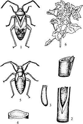 图5-11 绿盲蝽 1.成虫 2.越冬卵 3.卵放大 4.卵盖顶面观 5.五龄若虫 6.棉株被害状 【生活习性】 1年发生4~5代,10月下旬以卵在木槿等植物组织内越冬。越冬卵于次年4月上、中旬孵化,5月初开始为害。卵产于小枝梗、叶柄、叶片主脉等处。卵期4~5天。若虫共5龄,若虫期20多天。6~7月雨水多,湿度大,枝叶密茂,为害十分严重。干旱年发生较少。若虫与成虫有趋嫩性,都比较隐蔽,爬行迅速,十分活跃。1头绿盲蝽可为害数株菊花。 【防治方法】 (1)清除田间蒿类等杂草,减少盲蝽繁殖场所。 (2)在为害期,选喷40%氧化乐果或50%杀螟松1000倍,或喷20%杀灭菊酯2000倍液。在阴雨连绵天气,绿盲蝽大发生时,喷后隔1周再喷1次。 |
