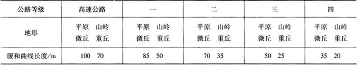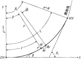 释义 | 缓和曲线的特征及曲线方程 对于某一缓和曲线我们已知的数据有: 1)路线的转角△; 2)根据公路的等级和地形状况确定的圆曲线半径R; 3)缓和曲线的长度,可根据公路的等级和地形情况依表11-5查得; 4)交点JD的里程和曲线加桩的整桩间距。 表11-5 公路按等级与地形规定缓和曲线的长度 1.回旋曲线的特征和方程 缓和曲线是回旋曲线的一部分,回旋曲线的几何特征是:曲线上任何一点的曲率半径ρ与该点到曲线起点的长度l成反比。即: 式中 c——比例参数。我国公路设计规范规定c=0.035V3,V为设计的行车速度,以km/h计。 在缓和曲线的起点l=0,则ρ=∞。在缓和曲线的终点(与圆曲线衔接处),缓和曲线的全长为lh,缓和曲线的半径ρ等于圆曲线的半径,即:ρ=R。故上式可写成: 可知,设计的行车速度愈快,缓和曲线的长度应愈长;设计的圆曲线半径愈大,则缓和曲线的长度就可以相应缩短一些;而当圆曲线半径R达到一定的值以后,就可以不设置缓和曲线了。 2.缓和曲线的切线角公式 缓和曲线上任意一点P的切线与曲线起点ZH的切线所组成的夹角为β,β称为缓和曲线的切线角。缓和曲线切线角β实际上等于曲线起点ZH至曲线上任一点P之间的弧长l所对圆心角β。如图11-9所示。 图11-9 缓和曲线切线角 在P点取一微分弧dl,它所对应的圆心角为dβ,则: 将公式ρl=Rlh=c=0.035V3代入上式得 将上式积分: 当l=lh时,缓和曲线全长lh所对的切线角称为缓和曲线角,以βh表示。 3.缓和曲线上任一点P坐标的计算 如图11-9所示,以缓和曲线起点ZH为原点,以过该点的切线为x轴,垂直于切线的方向为y轴。则任一点P的坐标可写为: 式中 dx、dy——纵横坐标微量。 将cosβ、sinβ按级数展开: 将上式代入dx、dy式中,再经积分整理后得: 上式称为缓和曲线的参数方程。 当l=lh时,即得缓和曲线的终点坐标值: |