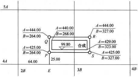 厂房矩形控制网的放样方案,是根据厂区平面图、厂区控制网和现场地形情况等资料制订的。在确定主轴线点及矩形控制网的位置时,必须保证控制点能长期保存,且要避开地上和地下管线,并与建筑物基础开挖边线保持1.5~4m的距离。距离指示桩的间距一般等于柱子间距的整数倍,但应不超过所用钢尺的长度。如图10-21所示为某工业建筑厂区平面图及厂区方格网。为进行厂区内合成车间的施工,可布设如图10-22所示的厂房矩形控制网P,Q,R,S的测设草图,其4个角点的设计位置距离厂房轴线向外4m,由此可计算出4个控制点的设计坐标,并计算出各点测设数据且标注于测设草图10-22上。