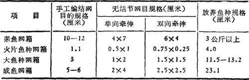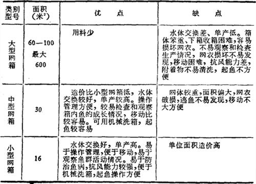 释义 | 网箱的制作 (1)网箱大小及形状 目前,网箱的规格大小很不统一。但根据生产实践,在相同的环境条件下,网箱大小对饲养管理以及鱼类生长以及产量都有一定影响。一般讲,网箱面积大,单位面积用料少,造价低,但因箱体内水体交换差,单产低,而且箱体笨重,操作管理不方便,抗风力低,易损坏逃鱼;网箱面积小,水体交换好,产量较高,操作管理也方便,但用料多,造价较高。所以说,网箱面积大小应全面考虑,因地制宜加以选择(表2-90)。目前多数面积为20-30平方米左右。 表2-90 各种规格网箱的优缺点比较 网箱的形状已趋一致,主要有长方形、正方形两种。多边形、圆筒形的网箱制作困难,生产效果并不显着,群众并不欢迎。 (2)网箱的高度 依靠天然饲料为主的网箱,其高度应取决于浮游生物量的水层分布,一般湖泊、河沟在1.5-2.5米,水库在2-4米之间,太高,下层浮游生物量少,作用不大,操作不便,浪费材料;人工投饵的网箱,可根据水的深浅而定,但也不宜过高。 (3)网目大小 网目大小主要取决于鱼种的投放规格,即既要保证不逃鱼,又能加大网箱的水体交换。网目过小,虽不易逃鱼,但网箱成本增加,影响水体交换,有碍鱼类生长;网目过大,水体交换虽好,但鱼种规格要相应增大,特别是育种,则会推迟进箱时间,影响生长。在生产实践中,具体网目大小可按经验公式计算,即 a=0.13L 其中:a=网目单脚长度(厘米); L=入箱鱼种的全长(厘米) 根据此公式再结合生产实践,放养鱼种的规格和网目大小列于表2-91,供参考。 表2-91 网箱网目具体规格 手工编结的网片,网目不均匀,进箱鱼种规格必须整齐,以防逃跑。 |