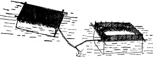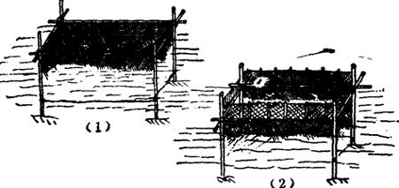 释义 | 网箱的类型 网箱养鱼因水域及饲养方法不同,可分为若干类型,一般有浮动式、固定式和沉下式三种,而浮动或固定式中又可分为敞开式和封闭式两种。 (1)固定式网箱 这种网箱一般设置在水位比较稳定、水流较急、交通频繁、水面狭窄、水深适中的河沟及小型湖荡中。网箱的四角由四支毛竹(或树桩)将框架(或纲绳)直接系在竹桩上(图2-33)。网衣的上下纲均用2.5毫米聚乙烯绳制成,箱底四角的边绳有用滑动形式绳套或用铁环直接紧套在竹桩上,绳套上再系一根绳索扣紧系于水面竹桩上,这样操作时可以上下滑动,便于操作管理,又不损伤网衣。 图2-33 固定式网箱 1.封闭式;2.敞口式 固定式网箱又分敞开和封闭式两种。敞口固定式不加盖网,但网衣出水部分要保证不让鱼类跳逸箱外,一般要达50厘米以上,同时要随时注意水位变化,调节网箱出水高度,防止逃鱼。这种网箱光照好,节约材料,管理方便。封闭式上部有盖网,养鱼保险,不易逃跑,但用料多,且上盖不易拉平,影响上层水流动,易长青苔而影响光照,上盖网片也易老化,管理不方便。 (2)浮动式网箱 这种网箱多设置在水位不稳定、水较深、水面开阔、船只来往较少的大水面,如湖泊、水库等水域里。主要结构是由箱体、框架、浮子、沉子、铁锚和锚绳。一般网箱面积不大,可直接将网箱系于框架上,如框架浮力不足,可适当增设浮子。网箱下纲上有沉子,以保证网目全部伸展开来。为使网箱固定飘浮,在框架两端系上绳索,与锚绳之间由转轴联接,锚绳另一端系上面锚或大石块固定,也可打桩固定(图2-34)。 图2-34 浮动式网箱 浮动式网箱也有敞口和封闭两种(图2-35)。如采用敞口浮动式网箱,则上纲上部要加一段高50厘米的网墙,四周用小毛竹片支撑,以防鱼跳跃逃跑。 图2-35 浮动式封闭投饵网箱 (3)沉下式网箱 整个箱体呈密封状态,然后沉入水中,并用沉子使其箱体扩张,这种方式在国外多用于海水养殖,我国东北部分地方也有用此法进行鱼种越冬的。 (4)封闭式投饵网箱 利用封闭固定式或封闭浮动式网箱,改装成投喂人工饵料的网箱。这种网箱就是在盖网的中间位置剪开一定的网目作为投饵口,以悬挂食台投喂饵料,投饵口的大小应视食台的大小而定,并设一定的浮力,可用木料制成宽度40-48厘米的木框,以承载食台和饵料。木框上再安装8-10号钢筋网,可以随意开闭投饵口。最好在木框长边两侧中间横绑一根活动木梢棍,作为悬挂食台之用。若木框浮力不足,可在木框四角加浮子。 网箱的形式多样,可因地制宜,讲究经济效益,并保证网目全部张开,水流畅通。 |