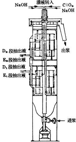 释义 | 置换漂白塔 (1)主要性能 图6-6-23 漂塔螺旋推进器 将多段漂白的几个段集中在一个塔内进行,取消各漂白段的洗涤过程。 置换漂白是使漂液在浆层中进行置换而不是与浆料混合。在置换漂白过程中能维持较高的浓度梯度,因此,可快速完成漂白反应。置换出来的抽出液,含有某些漂剂,有漂白作用,补充新漂剂后可循环使用。 2.特点 置换漂白设备在漂剂、热力,电力消耗及投资上都比常规的多段漂白节省很多,并且可以减轻污染。 3.实例 表6-6-10 置换漂白塔技术特征 塔内有4台卡米尔连续置换漂白器,用于各段置换漂液用。 图6-6-24 连续置换漂白塔 |