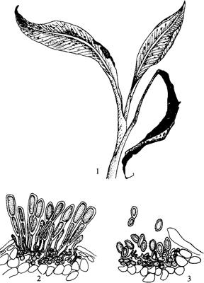 释义 | 美人蕉锈病 【症状】 病叶正反两面均呈圆形、黄色水渍状小斑,后期圆形增大,有疱状突起。病斑橙褐色至褐色,边缘出现黄绿色斑环,直径2~6毫米;病部小疱开裂散出橘黄色粉末,即夏孢子堆。冬天在病斑上产生深褐色粉状物,即冬孢子堆。严重受害的病叶,病斑累累,并可汇合成大块不定形的坏死区域(图8-2)。 图8-2 美人蕉锈病 1.症状 2.病原菌的冬孢子堆 3.病原菌的夏孢子堆 【病原】 为Puccinia sp.。夏孢子黄白色至橙黄色,长卵形至椭圆形,厚壁,具刺,生于短梗上,大小20~25微米×16~22微米。冬孢子堆生于表皮下,后期常与夏孢子堆混杂出现。冬孢子堆长椭圆形至棍棒形,顶端圆或略扁平,下窄,双细胞,在分隔处略收缩,色淡黄,大小25~60微米×13~18微米。冬孢子生于暗褐色梗上。有时在叶片上出现密密麻麻的黑褐色斑,并产生一些开裂的黑色粒点,此即为寄生菌(Darluca filum)。 【发病规律】 此菌与锈菌复合为害,病情加重,病斑迅速扩大,叶片卷曲凋萎。风吹水溅可将夏孢子传至健叶上,萌发、侵入、反复为害。在广州10~12月的凉爽天气发病仍很严重,炎热干燥的天气反而较轻。一般4月份即见发病。 【防治方法】 (1)加强检疫。严禁带病繁殖材料引进或输出。病区在种植之前苗木要进行严格的消毒。 (2)冬季清除庭园病叶及病株残体,集中烧毁。 (3)用65%福美锌400倍液,每隔7天1次,共2~3次,或喷0.3度石硫合剂1次,或20%粉锈宁乳剂2000~3000倍液1次,注意交替使用,可以减轻病情。 |