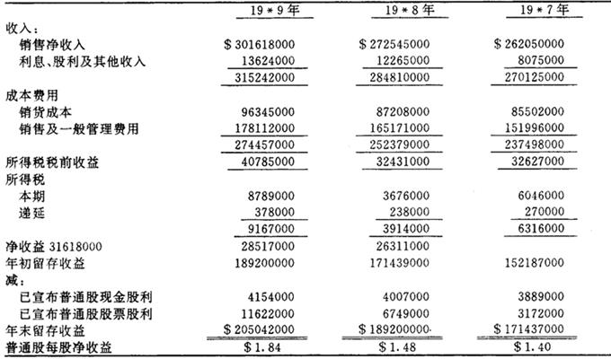 收益表的格式有多步式(mutiple-step)和单步式(Single-stepform)两种格式。多步式与我国惯用的利润表格式相类似,在表内将各种收入和成本费用项目分类排列,分段加总并抵减,以反映销售毛利、经营损益等中间计算结果,再加减非常性损益后,得出税前净利润或净亏损。单步式则简单地把一切收入项目列在一起并求出合计;把一切成本费用和损失项目也列在一起并求出合计;两个合计数的差额,即是企业的净收益(税前或税后,视不同的设计而定)或净亏损。这种格式不反映毛损益、经营损益等中间计算结果,但编制程序比较简单,特别是在几个年度对比的情况下,表的设计和编制更显得便利。美国的公司企业采用这格式的占较大比重。图表5-2-2所列美国公司的收益表,其格式即为反映税前利润的单步式,其中也包括留存收益的内容。 图表5-2-2 XYZ股份有限公司收益及留存收益表 12月31日结束的会计年度